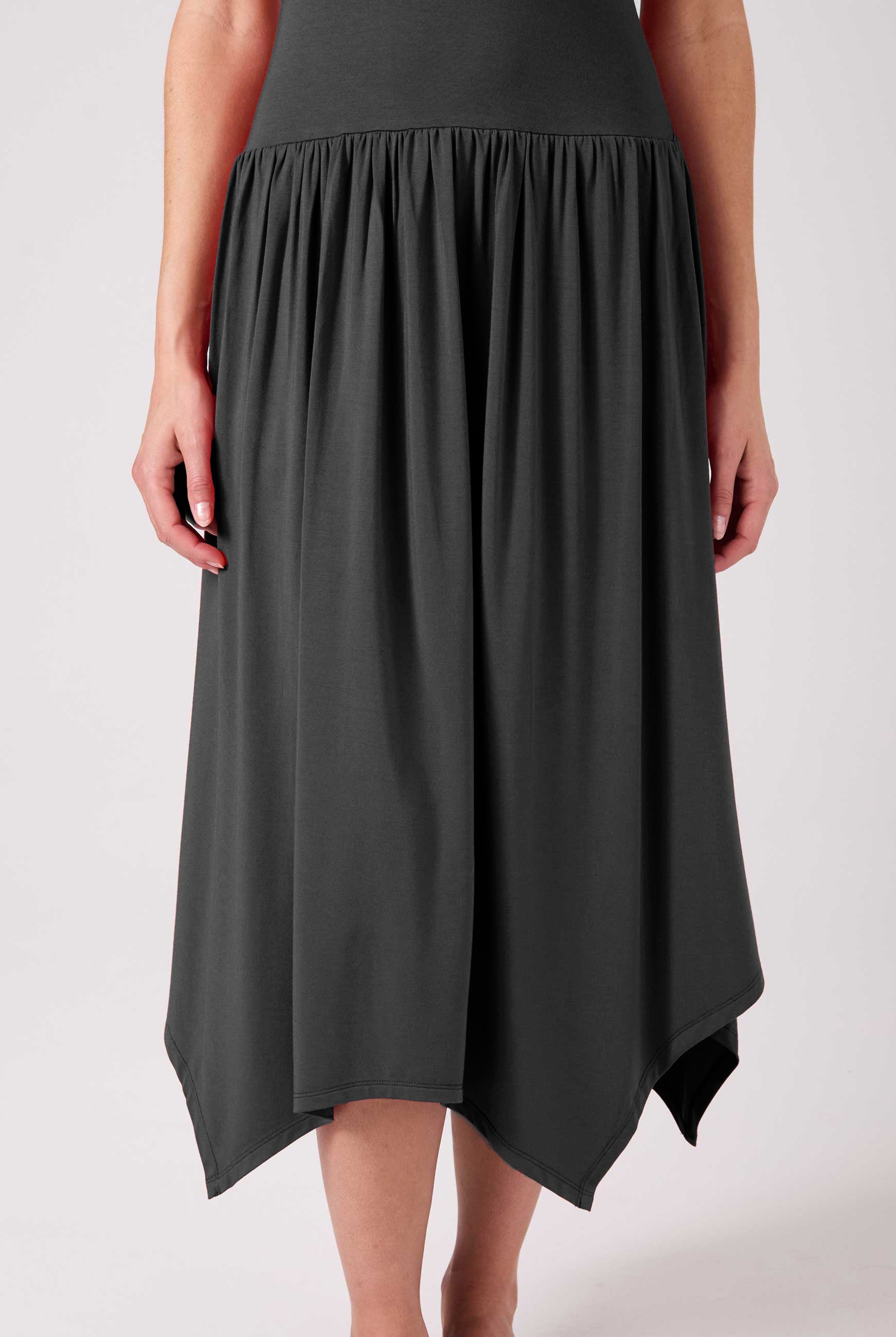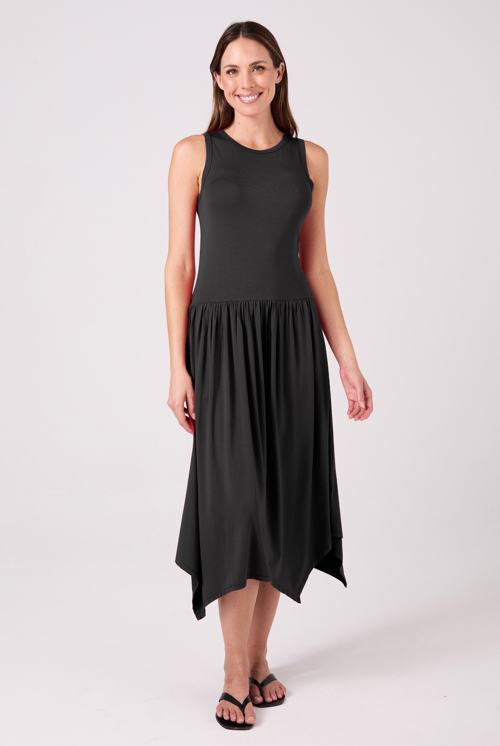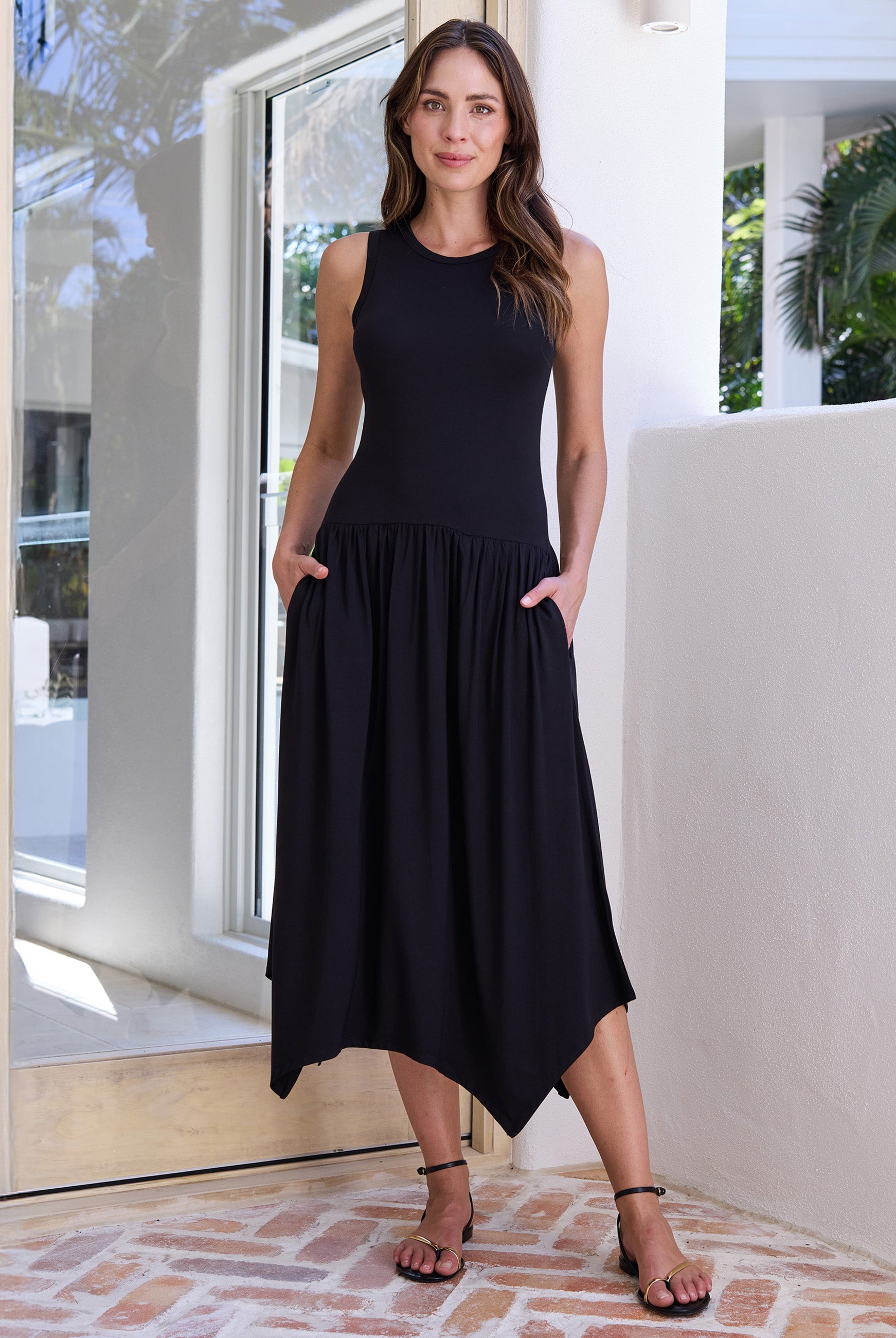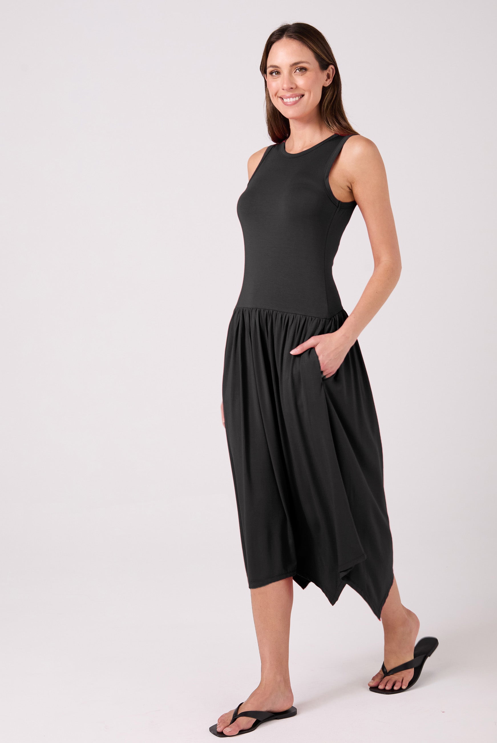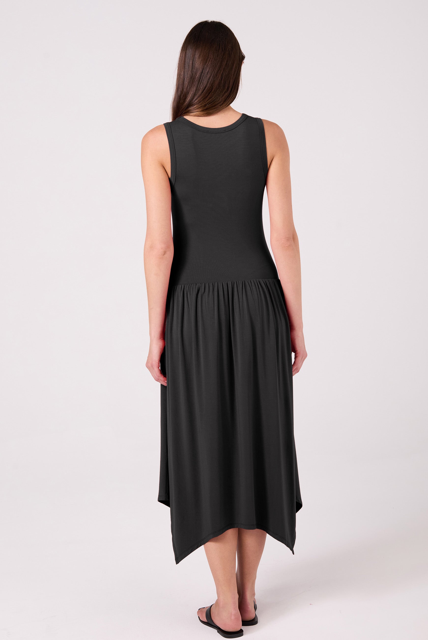 Crafted from an ultra-soft, breathable fabric, this sleeveless dress drapes beautifully for an effortlessly flattering fit. The dropped waistline creates a relaxed, easy silhouette, while the asymmetric hem adds a touch of modern edge and graceful movement with every step.