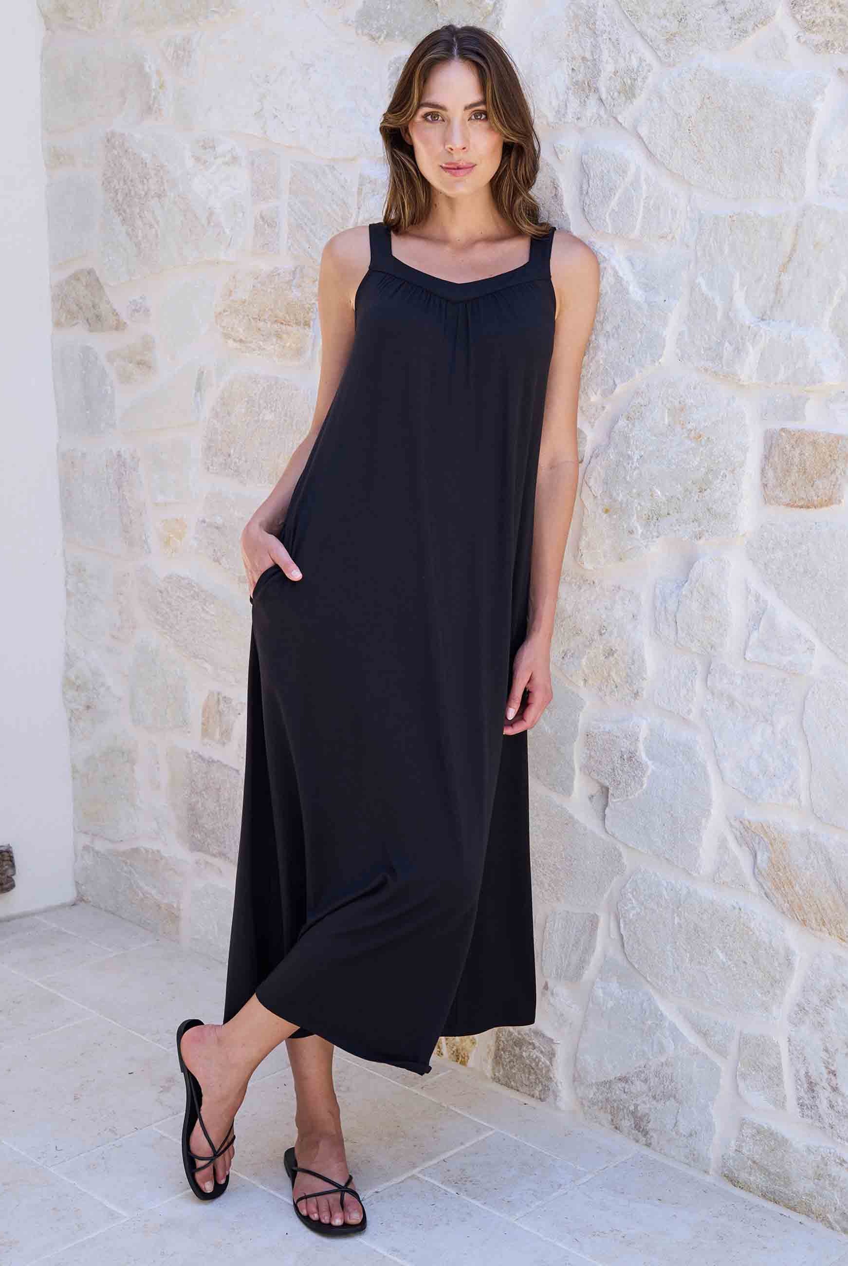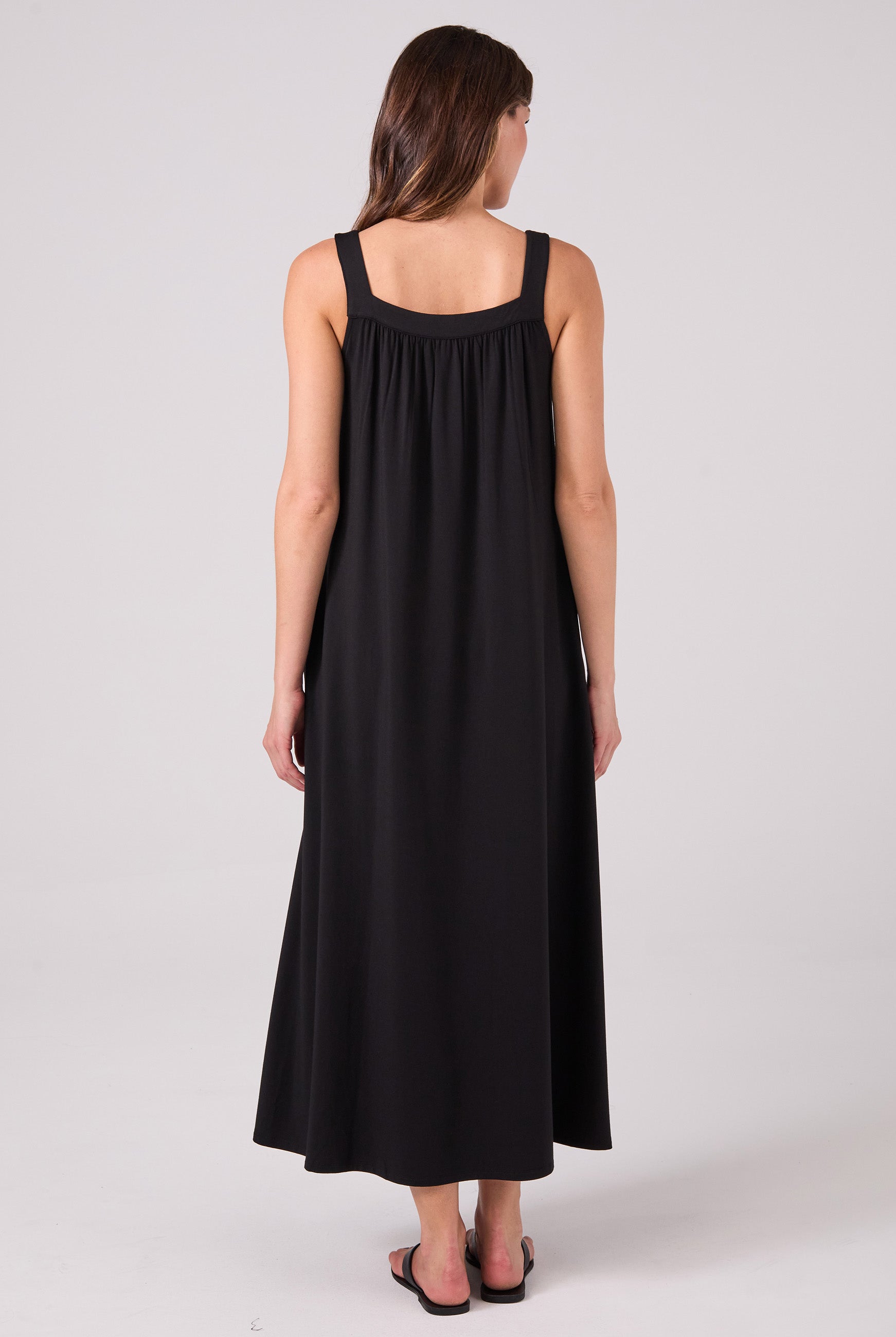 The Isabelle Midi Dress combines timeless design with sustainable craftsmanship. Made from luxuriously soft and eco-friendly Lenzing Modal®, this sleeveless dress feels lightweight and soft on the skin, offering all-day comfort. A high neckline, accented with a refined mother-of-pearl button, brings understated sophistication, while the relaxed A-line silhouette creates a flattering, flowing shape that suits every body type. Functional side pockets add a practical touch, making it as versatile as it is stylish. Perfect for any occasion, the Isabelle transitions effortlessly from casual days to evening elegance. Pair it with sandals for a laid-back vibe or elevate it with your favorite accessories. Designed to be timeless, this sustainably crafted dress is a wardrobe essential for those who value comfort, style, and the planet.
