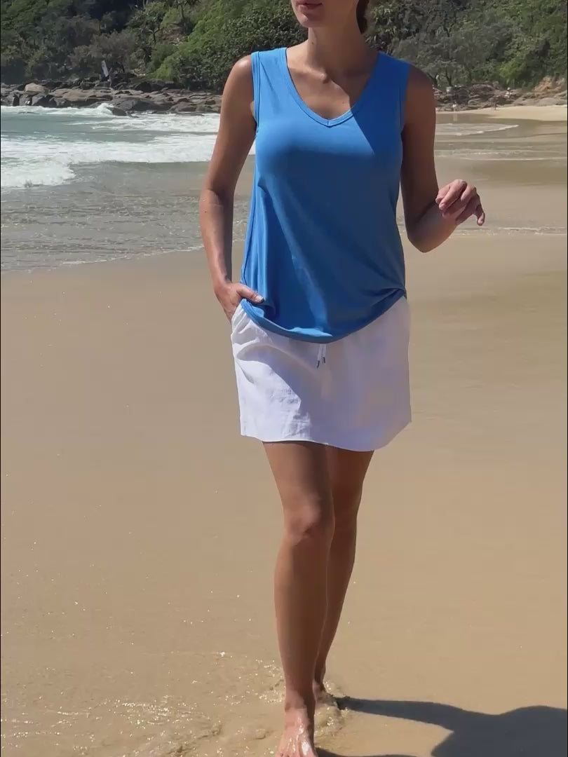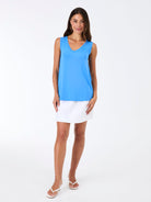 A timeless V-neck sleeveless top with a flattering hip-length swing shape, designed to flatter all body shapes. Lightweight and easy to wear, it drapes beautifully and works perfectly on its own or layered. A luxury essential for effortless everyday dressing. Front body length 65cm for a small.