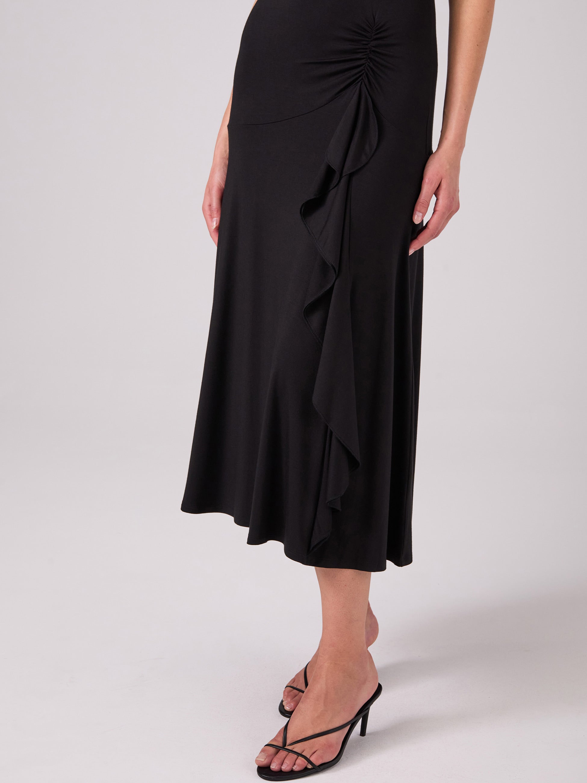 I am very happy with my recent purchase - the Maria Ruffle Dress in Cherry. The fabric is soft and falls nicely over my waist & hips. The cut of the fabric makes it very flattering, and the ruffle on the front gives it a bit of sexiness. I am going to enjoy wearing this dress and expect to get a lot of compliments.