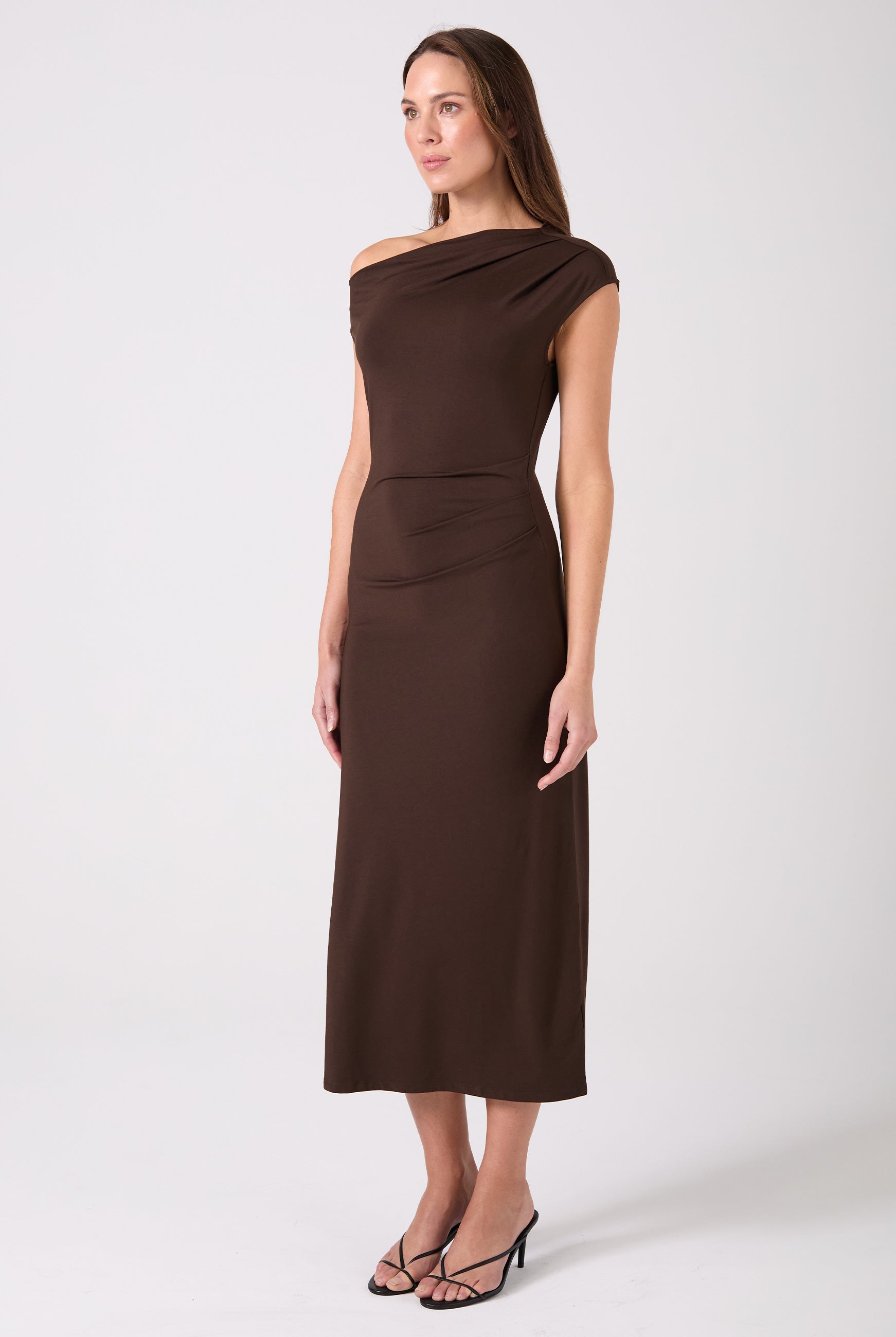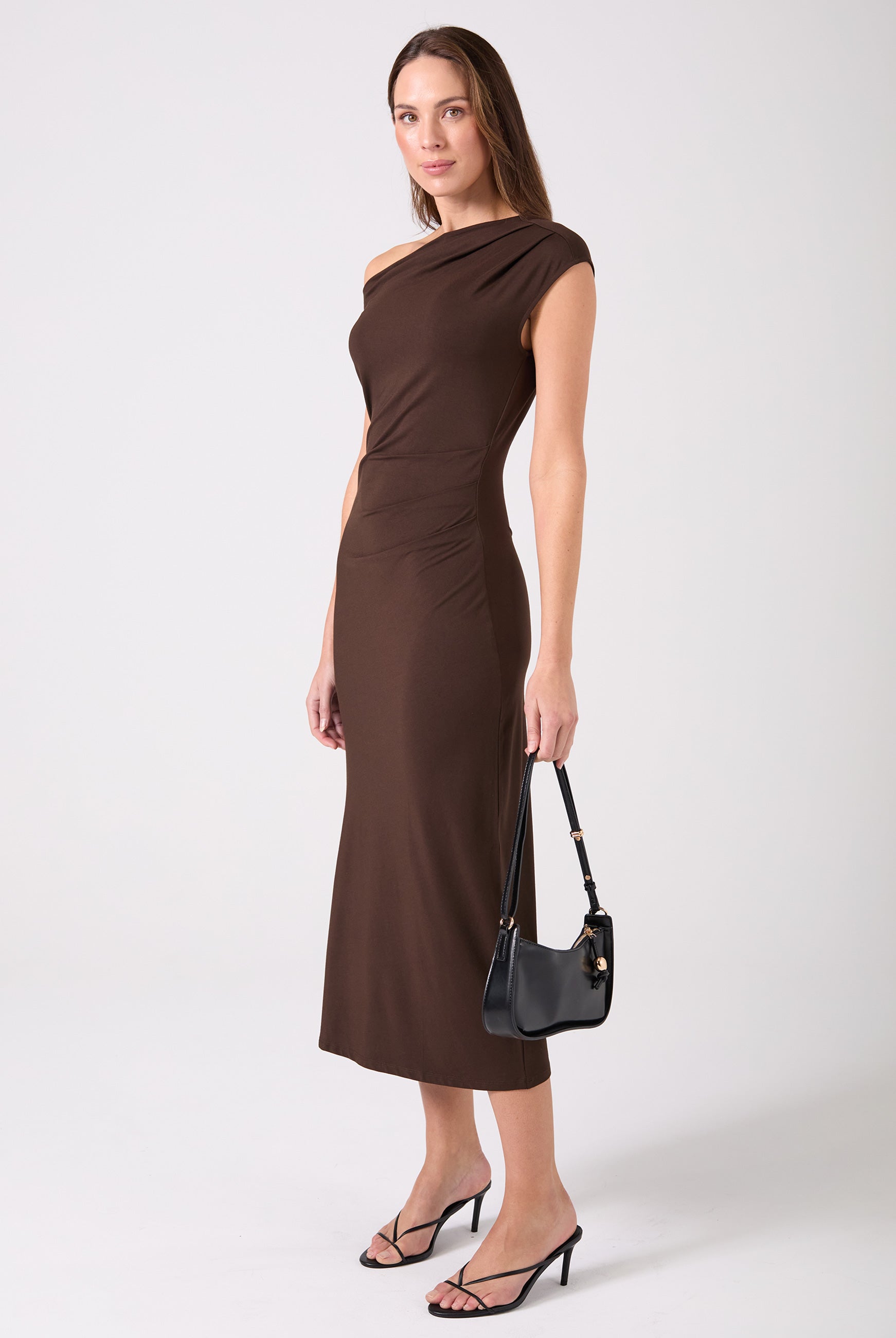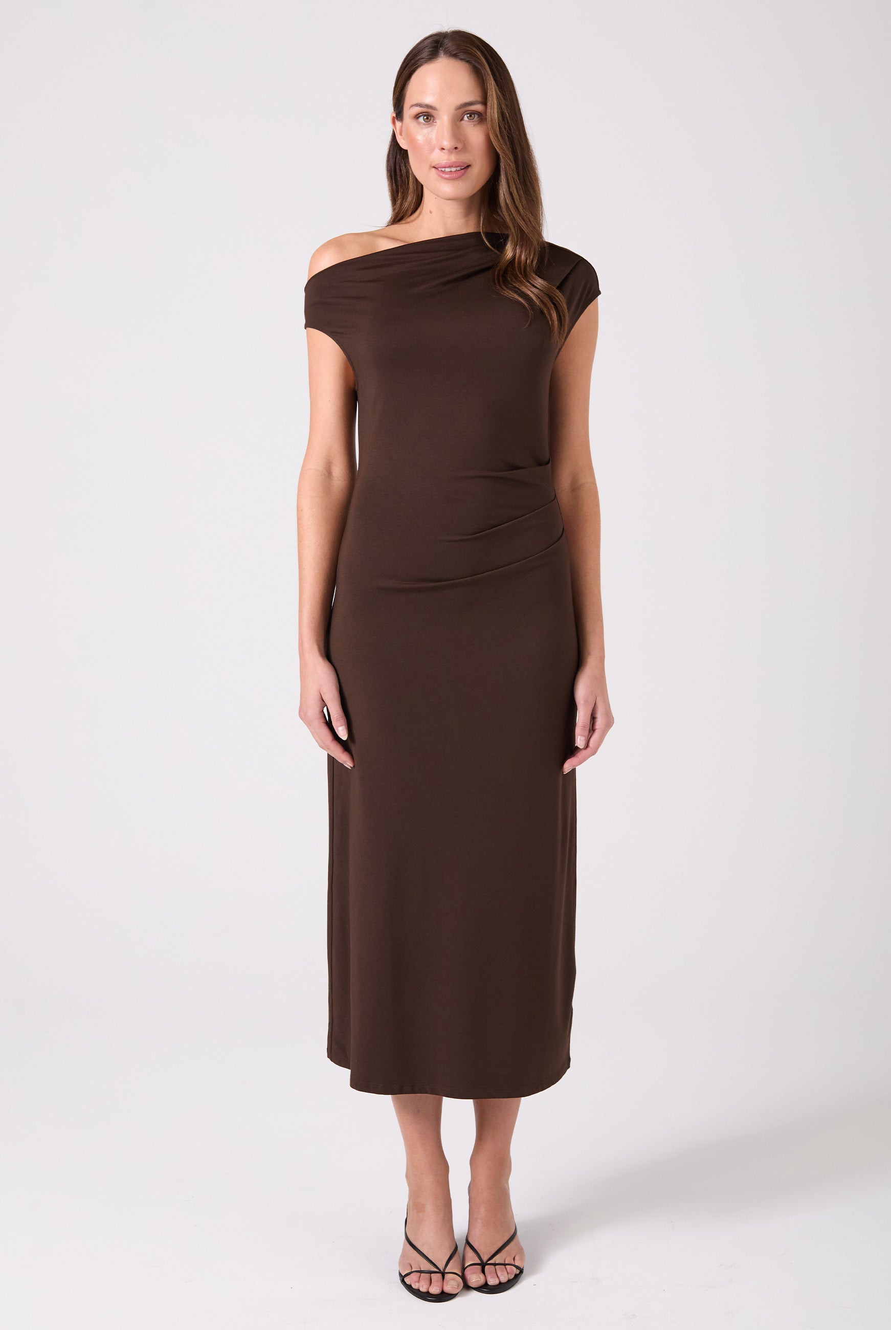 Designed with a flattering asymmetric hem and gently gathered side ruching, this piece celebrates the feminine silhouette—enhancing your shape in all the right places. The off-shoulder neckline adds a modern, confident touch that transitions seamlessly from day to night.