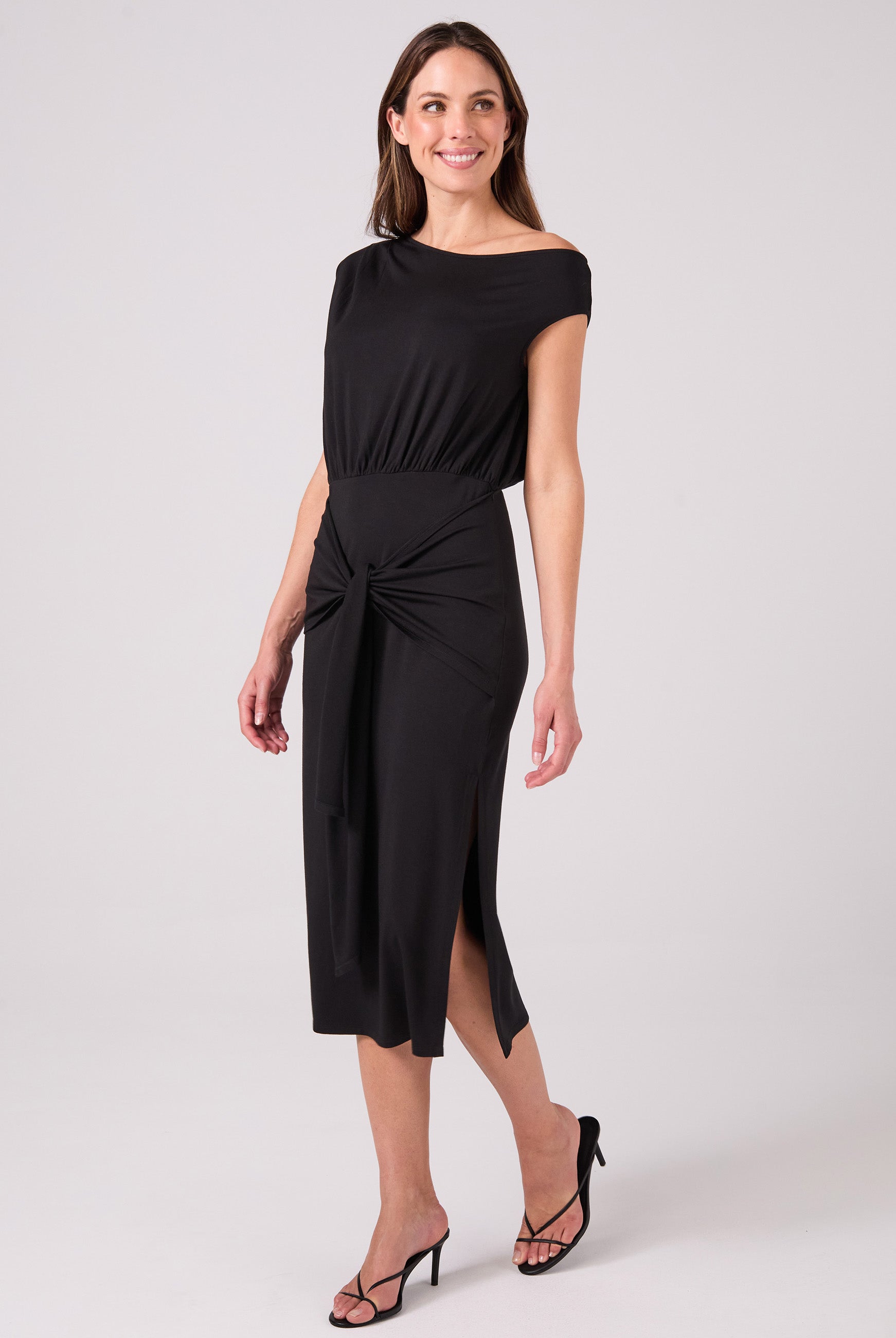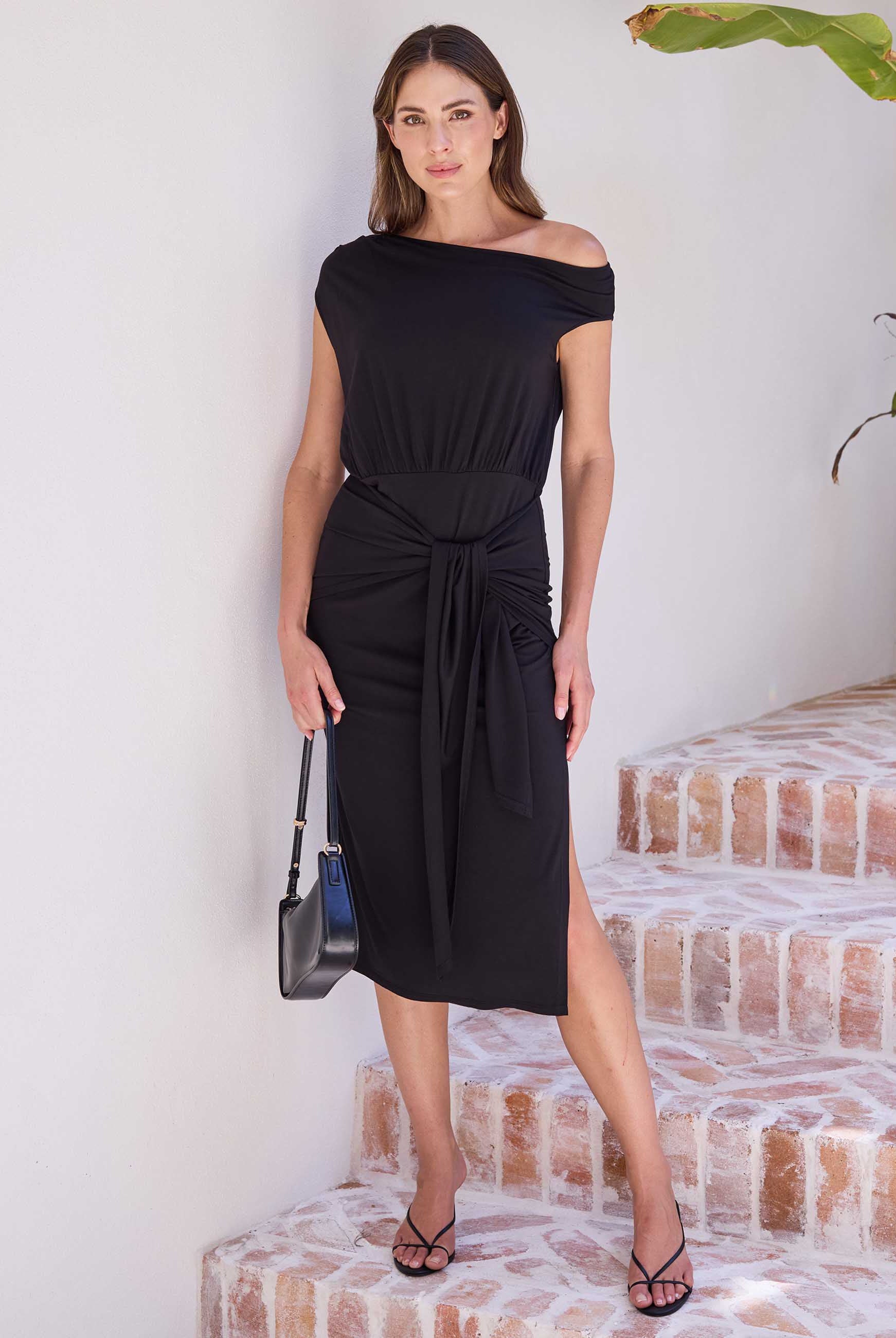 The Athena Dress is the most versatile and flattering style of the season. Thoughtfully designed to complement all body shapes, it features a soft tie that can be worn at the front or back—when tied at the front, it’s fully adjustable to create your perfect fit. The mid-calf length offers a graceful silhouette that moves effortlessly from day to night.