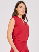 The thoughtful cap sleeve is designed to flatter the upper arm, while the refined placket is enhanced by a softly structured collar detail that frames the neckline for a polished finish. Cut to a perfect bum-covering length, it offers confidence and ease of movement, whether paired with leggings, wide-leg pants, or denim.