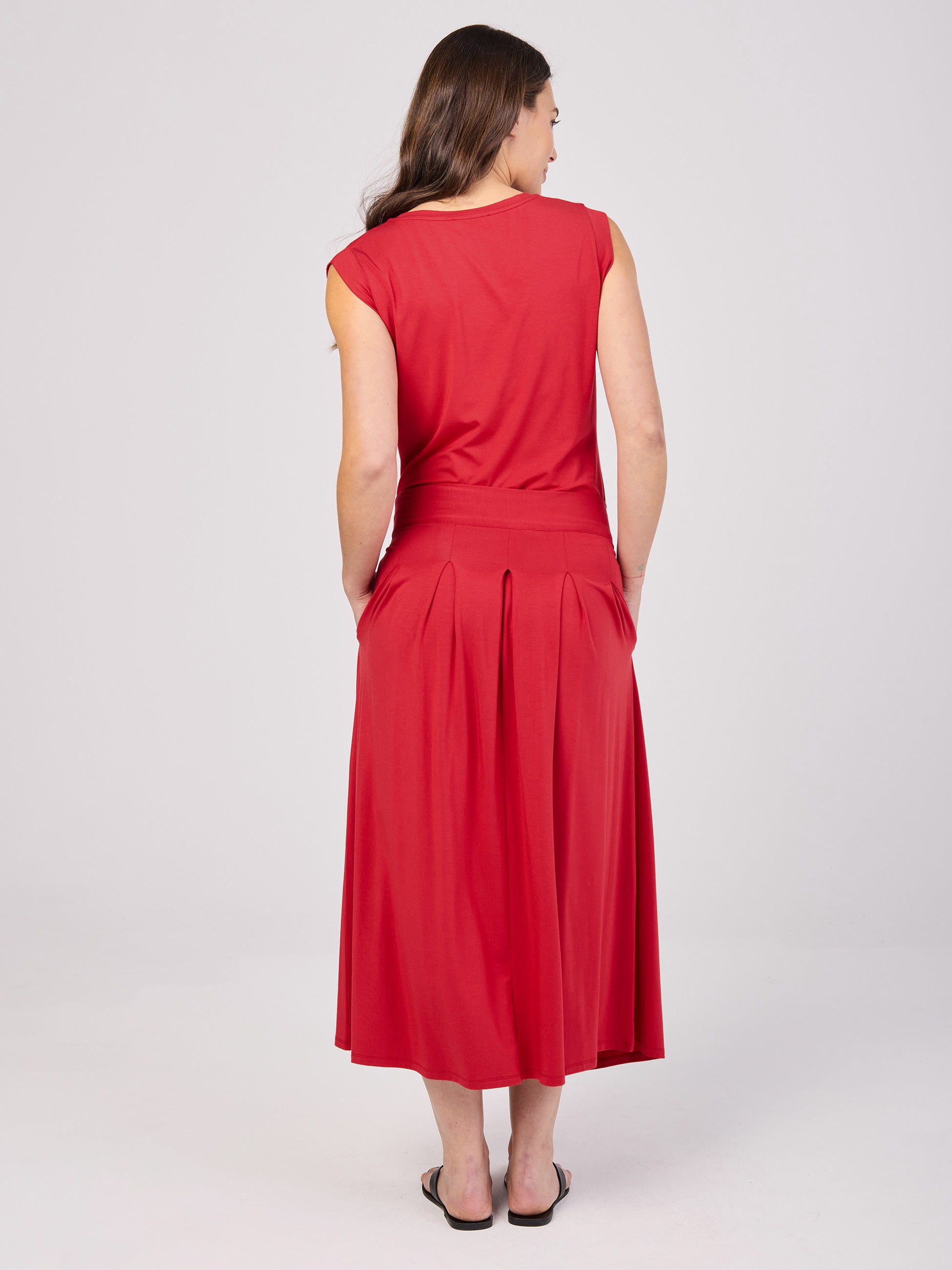 Waistband is generous, drop waist part is quite fitted so interesting style and fit. Glad I went up a size. Soft and comfortable fabric, lovely quality and cherry colour is divine!