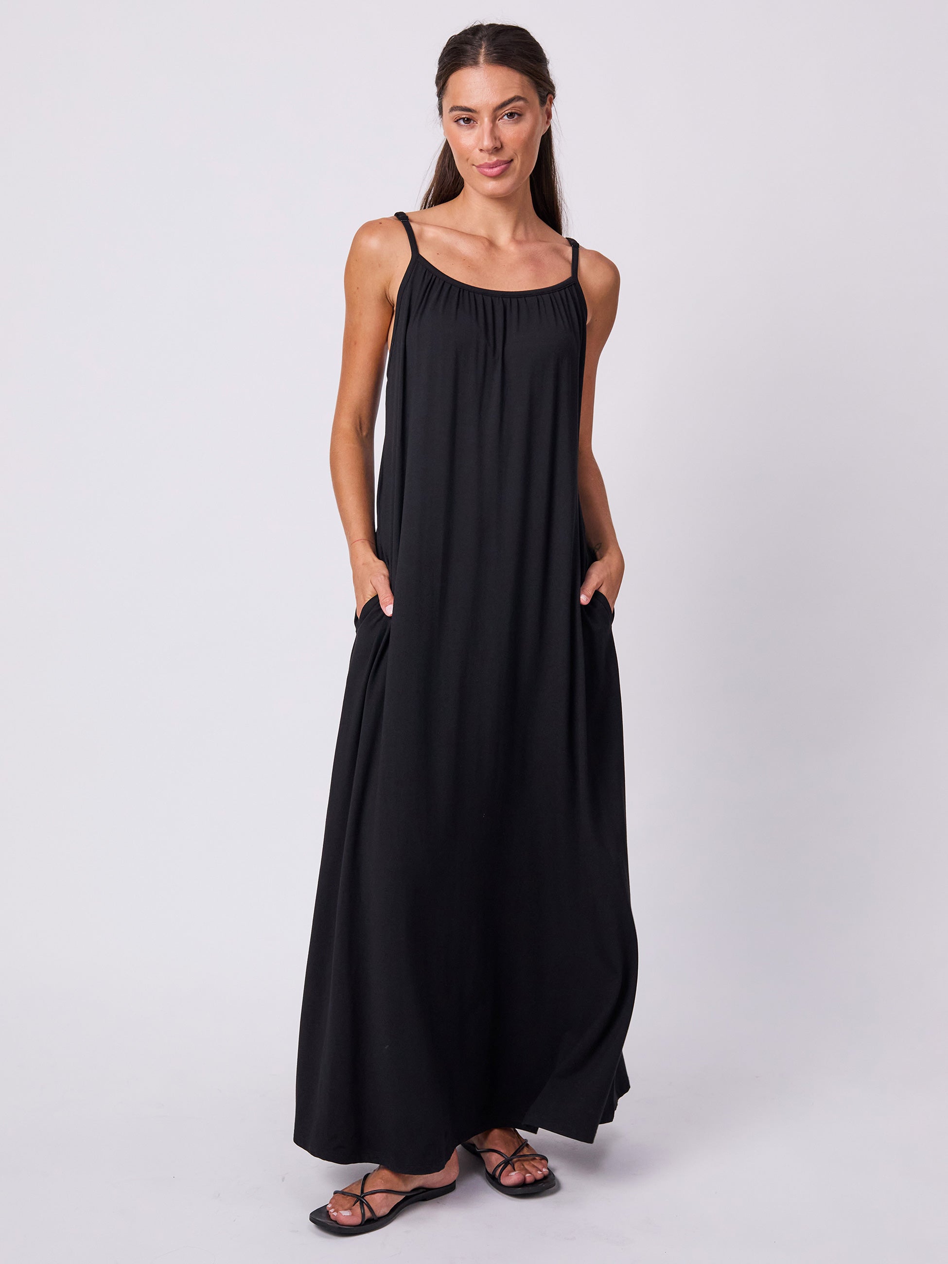 "Lovely long soft flowy dress. Super comfortable with adjustable straps. Great pockets. Goes with everything. Easily dressed up or casual."