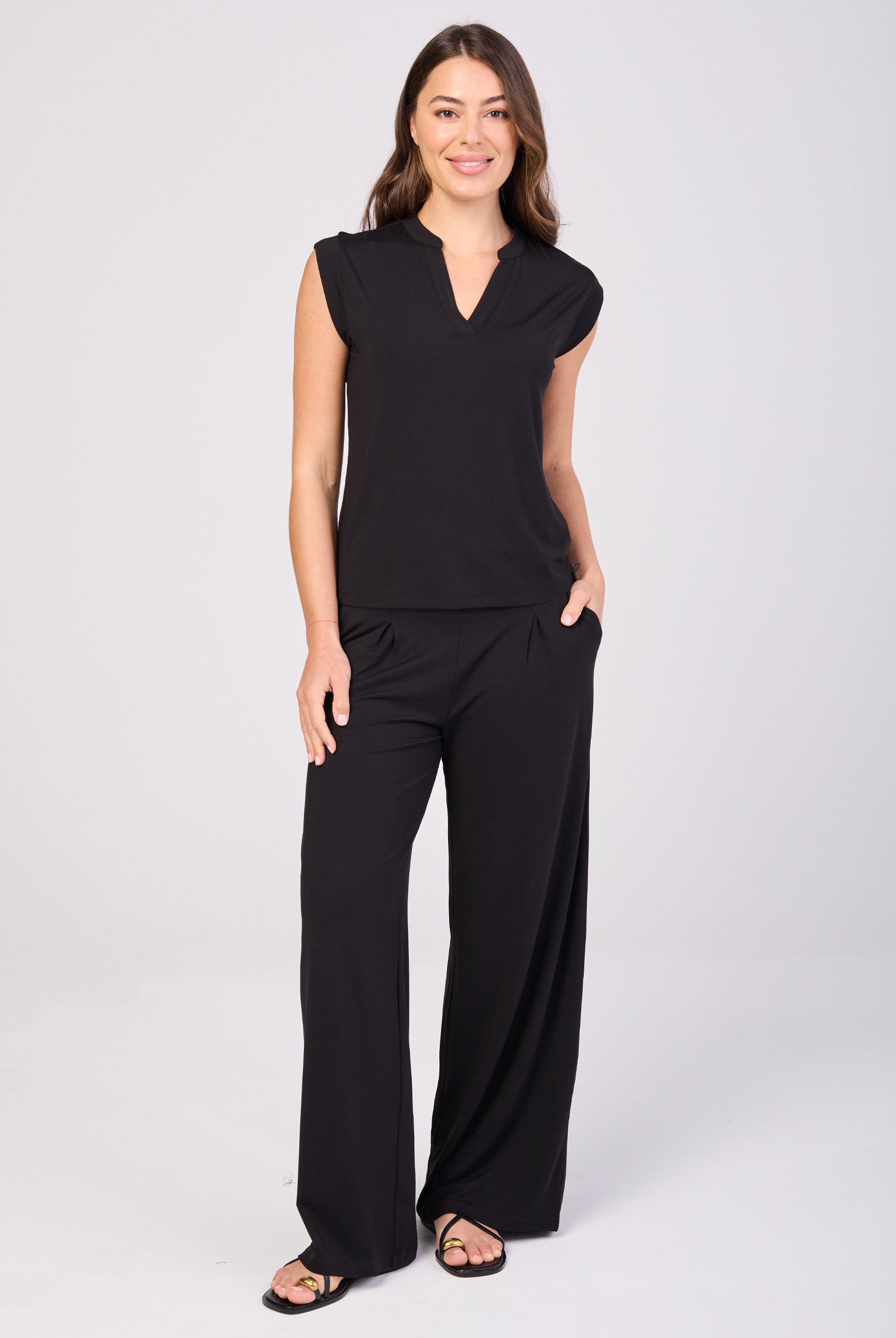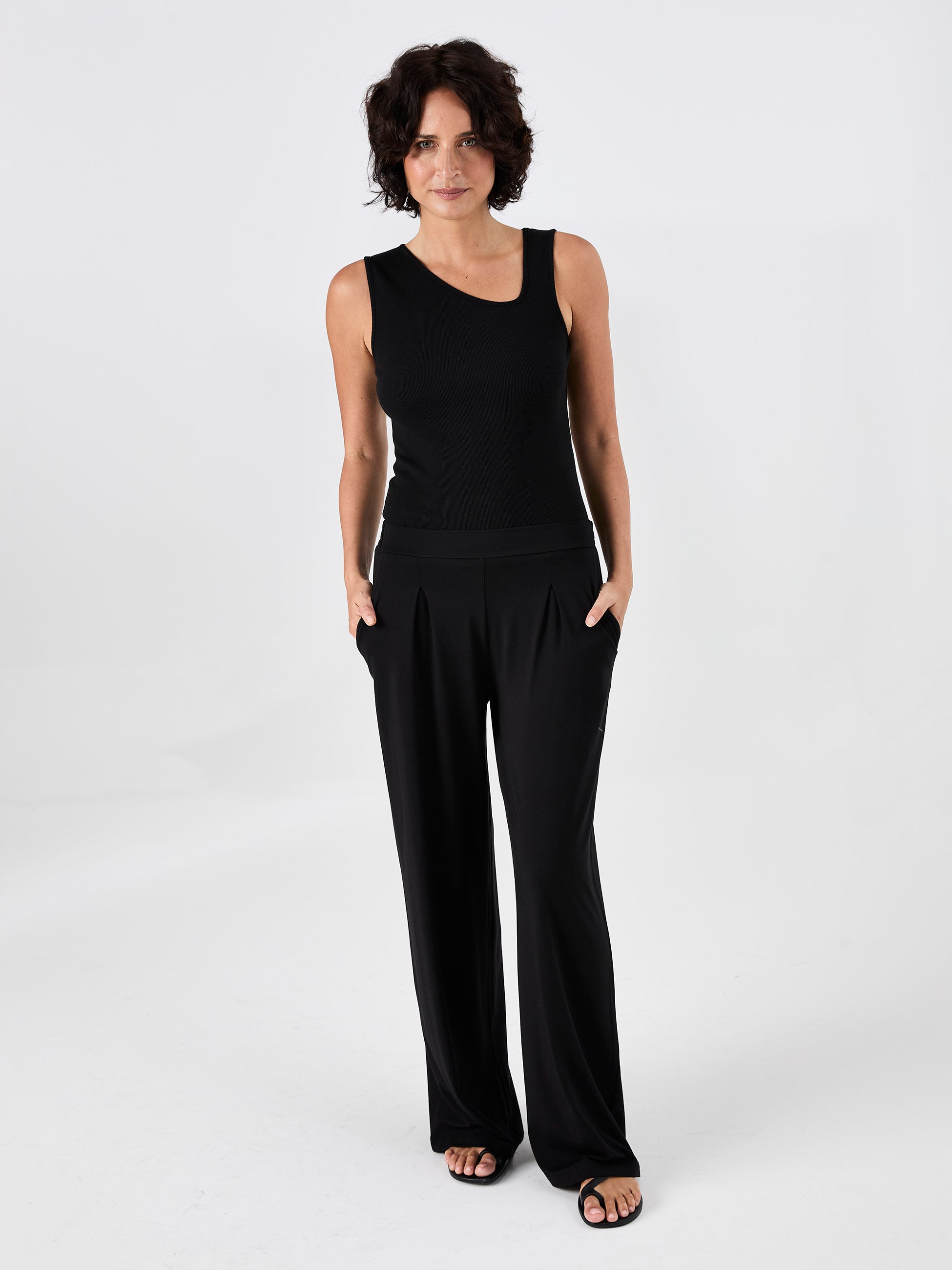 A relaxed yet elevated essential, the Wide Leg Pleat Front Pants offer effortless style and all-day comfort. Designed with a soft elastic half waist, pleat front detailing, and side pockets, they create a flattering drape while ensuring a flexible fit. The relaxed silhouette makes them a versatile staple, perfect for dressing up or down. These pants are a timeless wardrobe must-have, whether paired with a tailored top for a polished look or a casual tee for easygoing style.