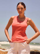 Lovely quality rib tank, neckline is unique and flattering. Comfortable style and size. Neat fit. I sized up one size for a less fitted look and it sits well. Great for hot weather and for layering. White is fresh and pretty.