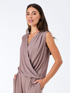 "I have several of the Athena drape tops and lop this new colour mulberry. I bouight the matching pants and can't wait to wear them both!"