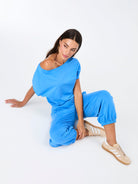 French Terry Short Sleeve Off Shoulder Sweatshirt - Cobalt