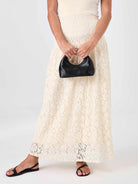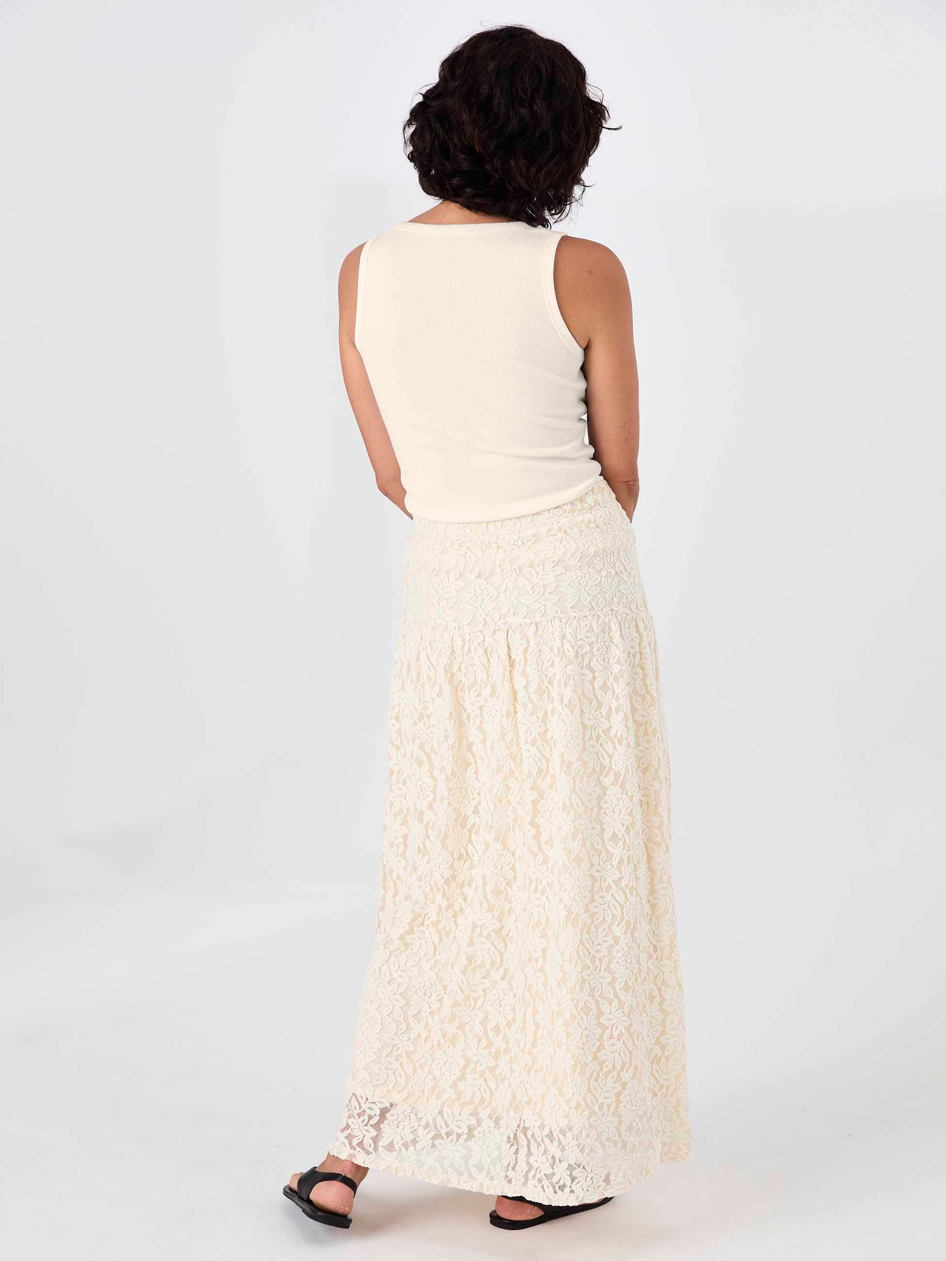Effortlessly confident and versatile, this maxi skirt is designed with a modern dropped waist and elevated by delicate embroidered trim. The floral lace brings a feminine accent, while the soft elastic waistband allows for easy slip-on comfort. Finished with a thoughtfully placed lining, it offers full coverage while keeping its light, airy feel.