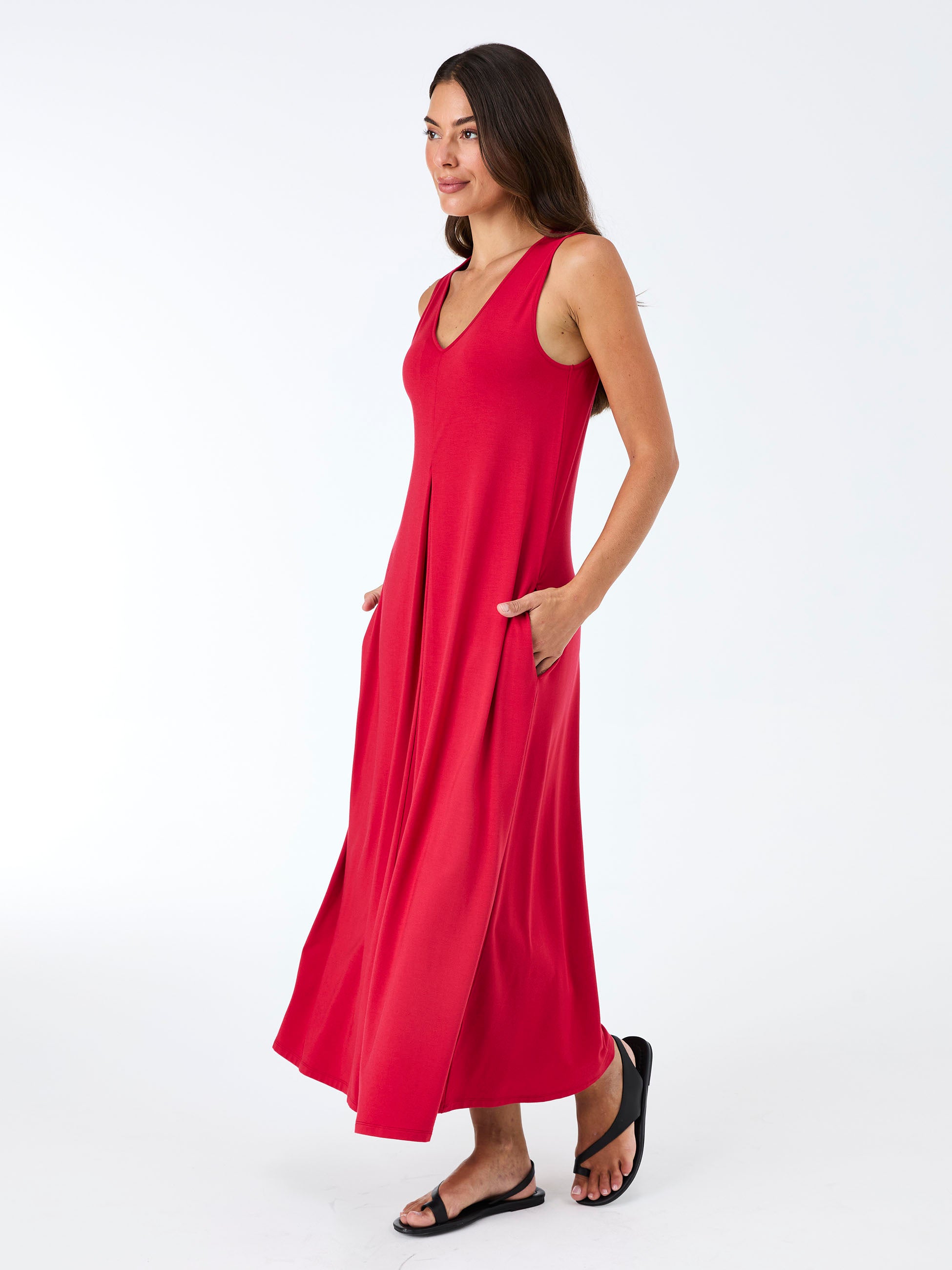 Effortless and refined, the Dionee Dress features a soft front pleat, sleeveless silhouette, and a flattering midi length that falls to the calf. Designed for ease of dressing, it offers a gentle drape with a soft, comfortable feel against the skin. An elegant everyday piece made to move seamlessly from day to night. Dress front length 121cm