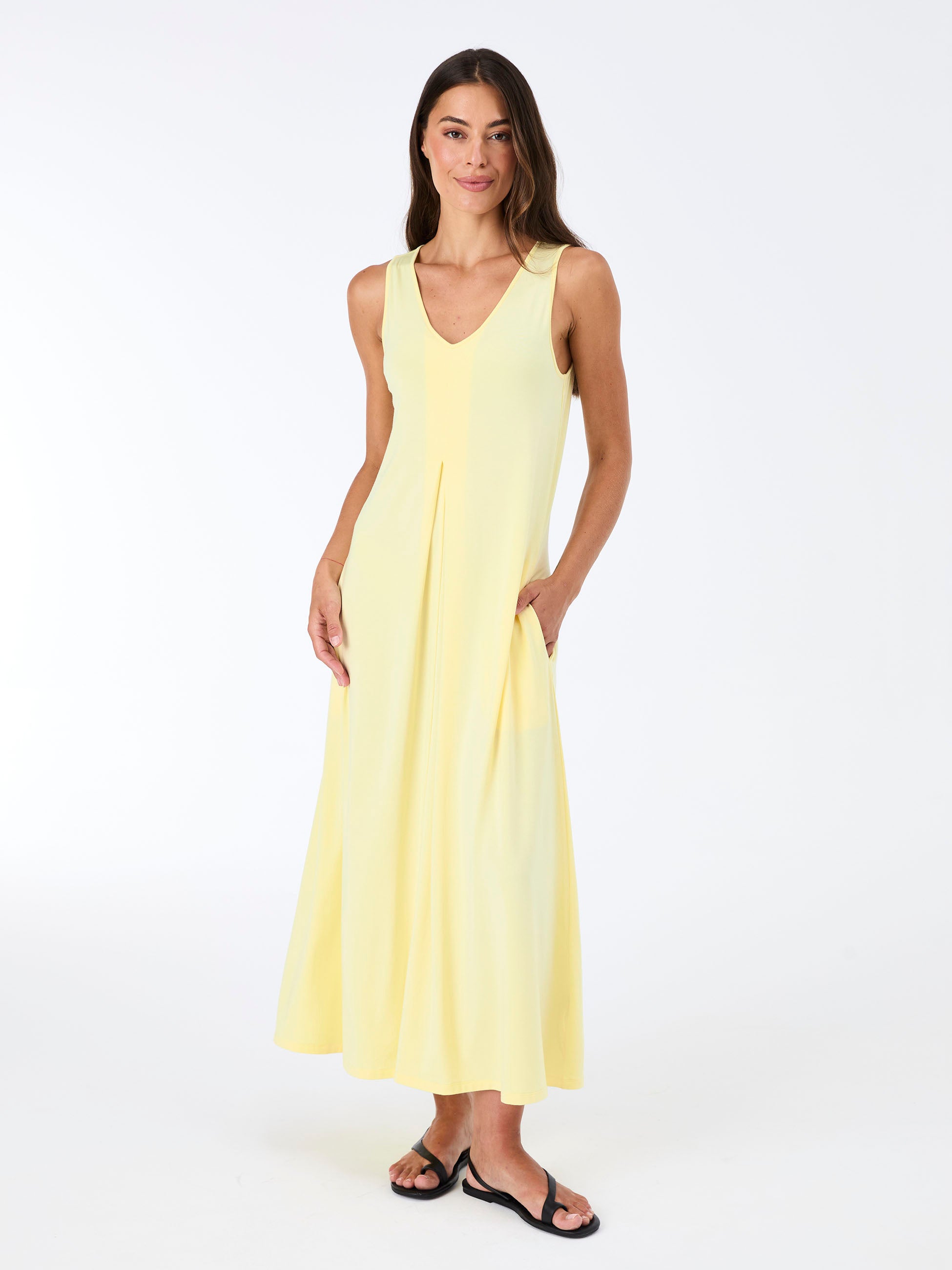 Effortless and refined, the Dionee Dress features a soft front pleat, sleeveless silhouette, and a flattering midi length that falls to the calf. Designed for ease of dressing, it offers a gentle drape with a soft, comfortable feel against the skin. An elegant everyday piece made to move seamlessly from day to night. Dress front length 121cm