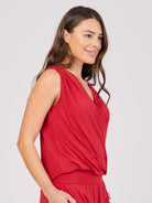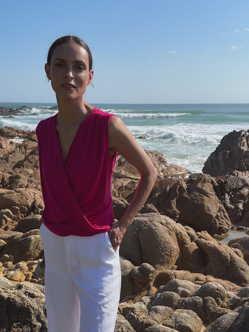 The draped sleeveless top that flatters without fuss. Luxe‑soft modal, no gaping, and ready for work, travel, or dinner.