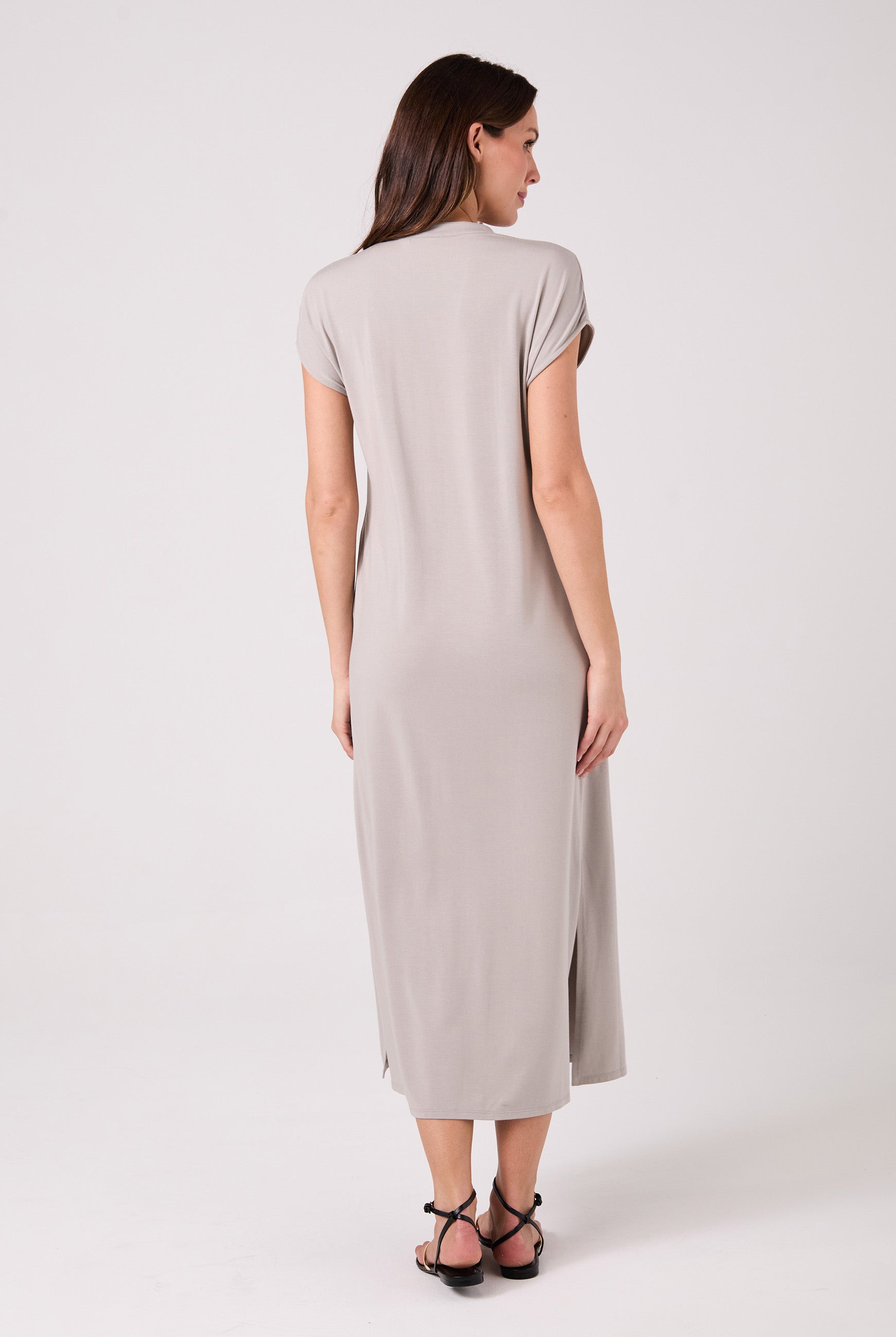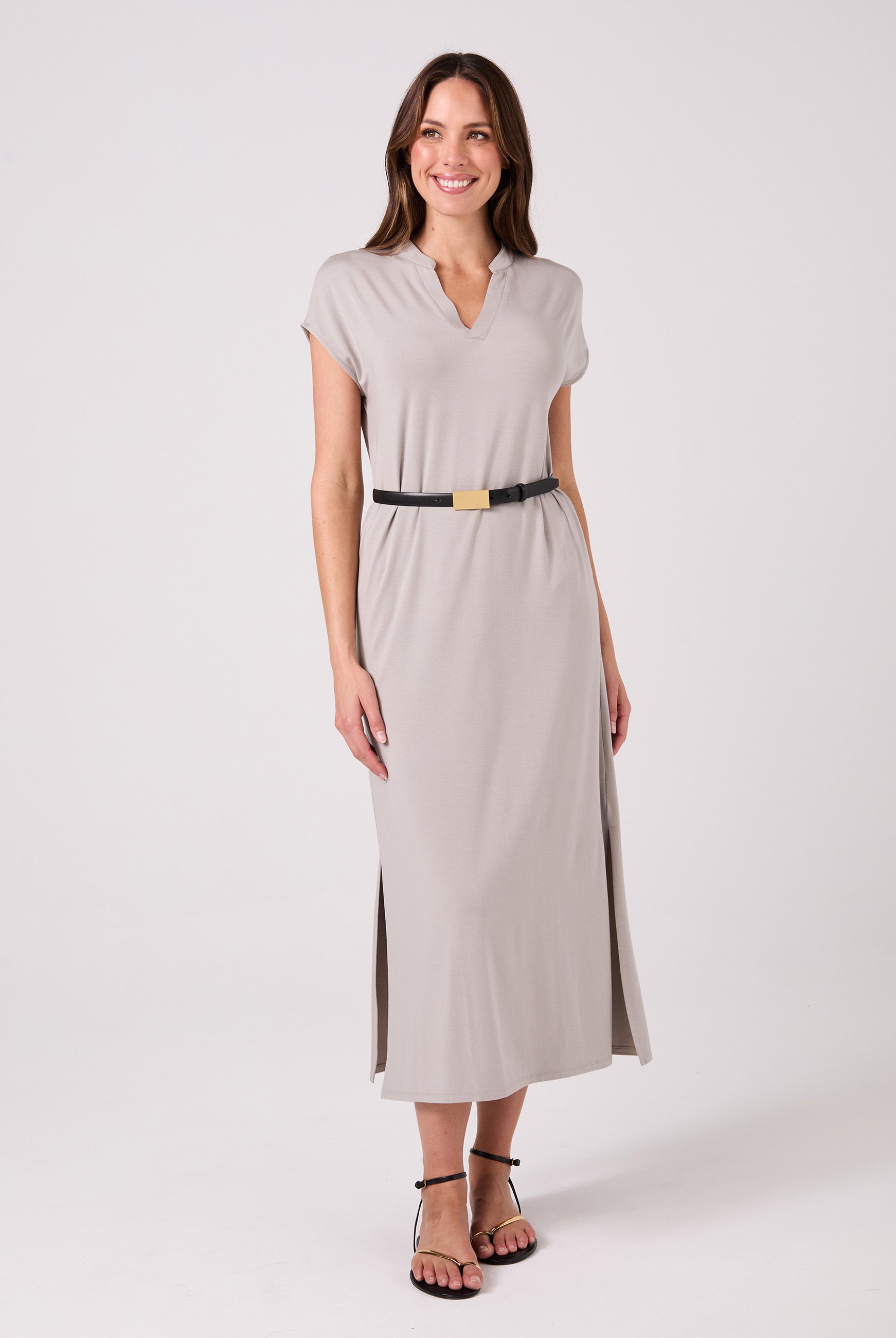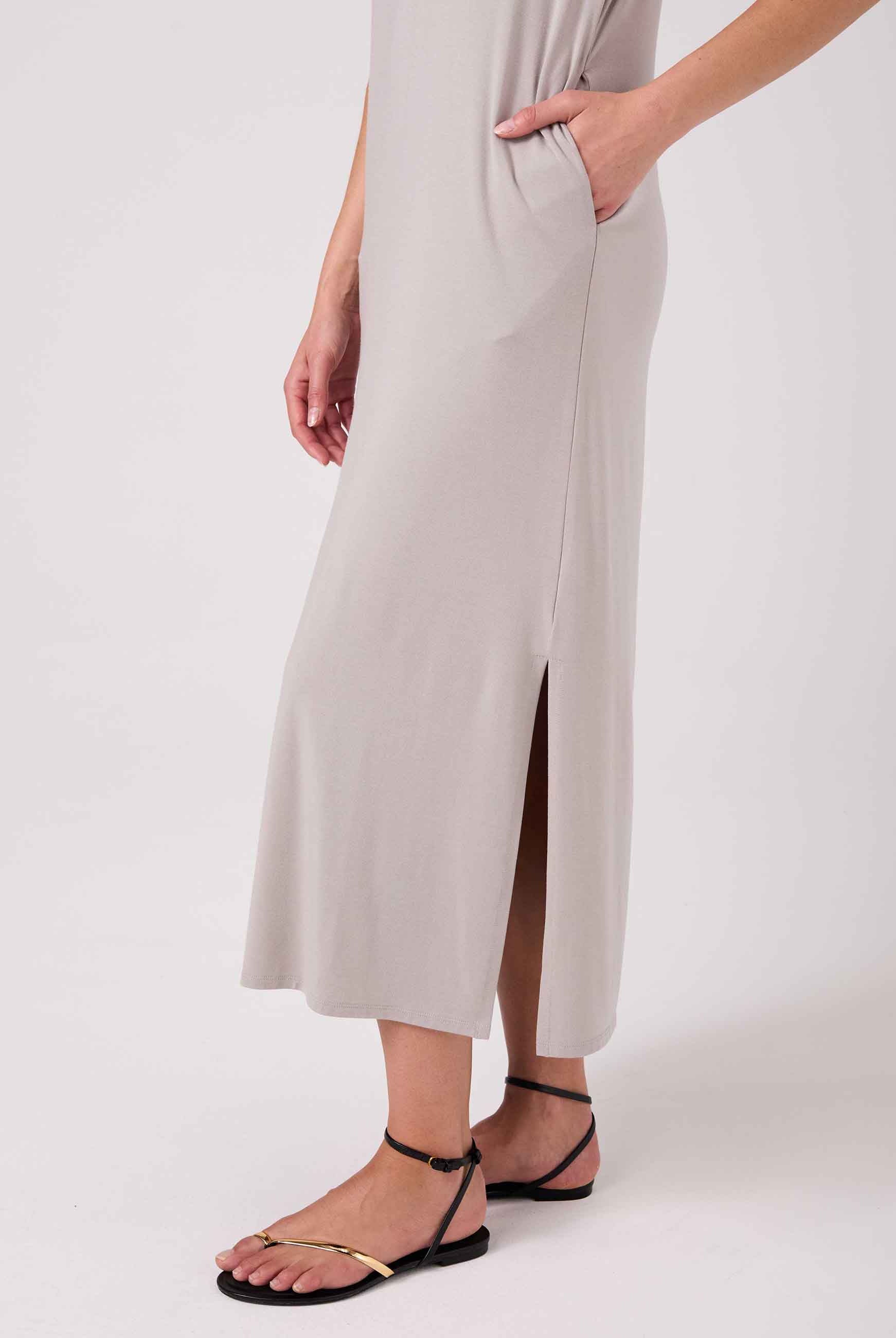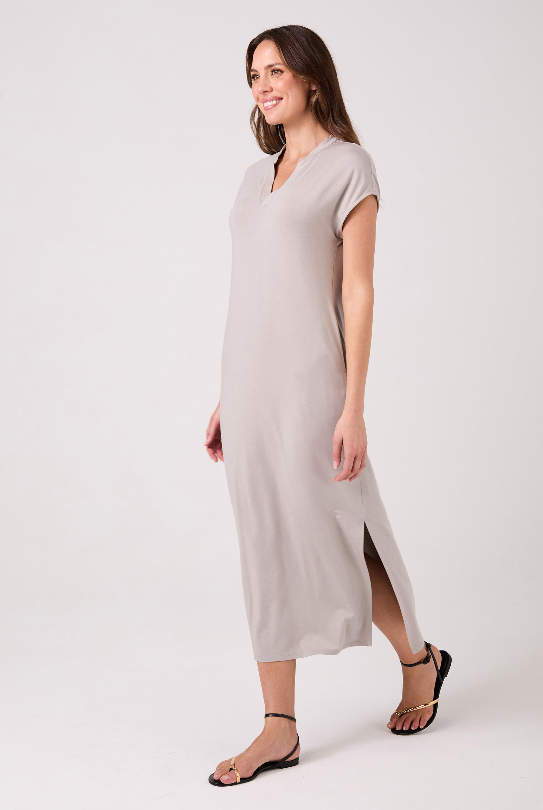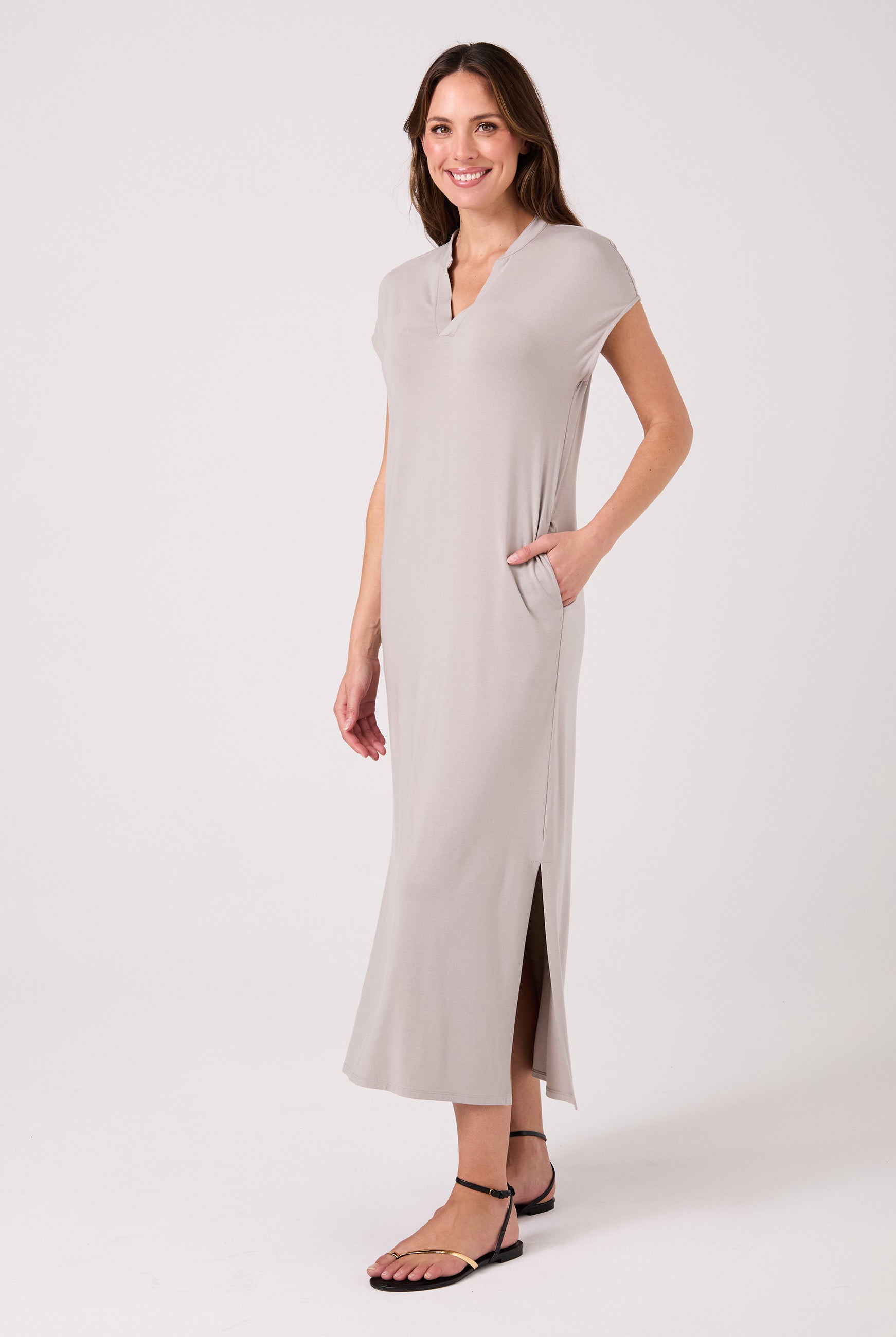 Effortlessly elegant and endlessly wearable, the Serene Flow Maxi Dress is crafted from ultra-soft, breathable fabric for all-day comfort. It features a flattering V-neckline, cap sleeves, side pockets, and flowy side splits, offering both style and ease. A versatile wardrobe staple, this maxi drapes beautifully over all body shapes, making it perfect for getaways, weekend lounging, or elevated evening looks.