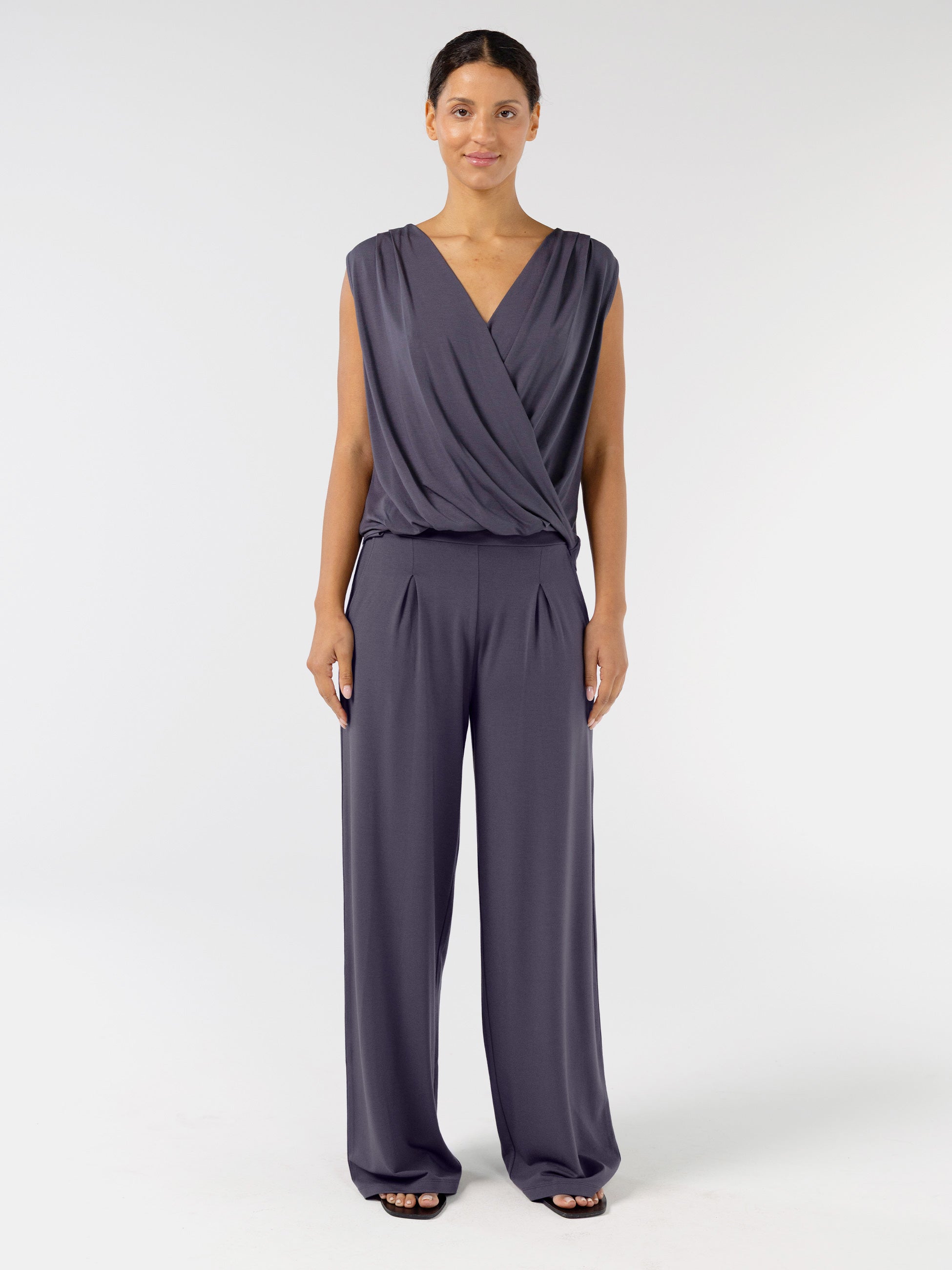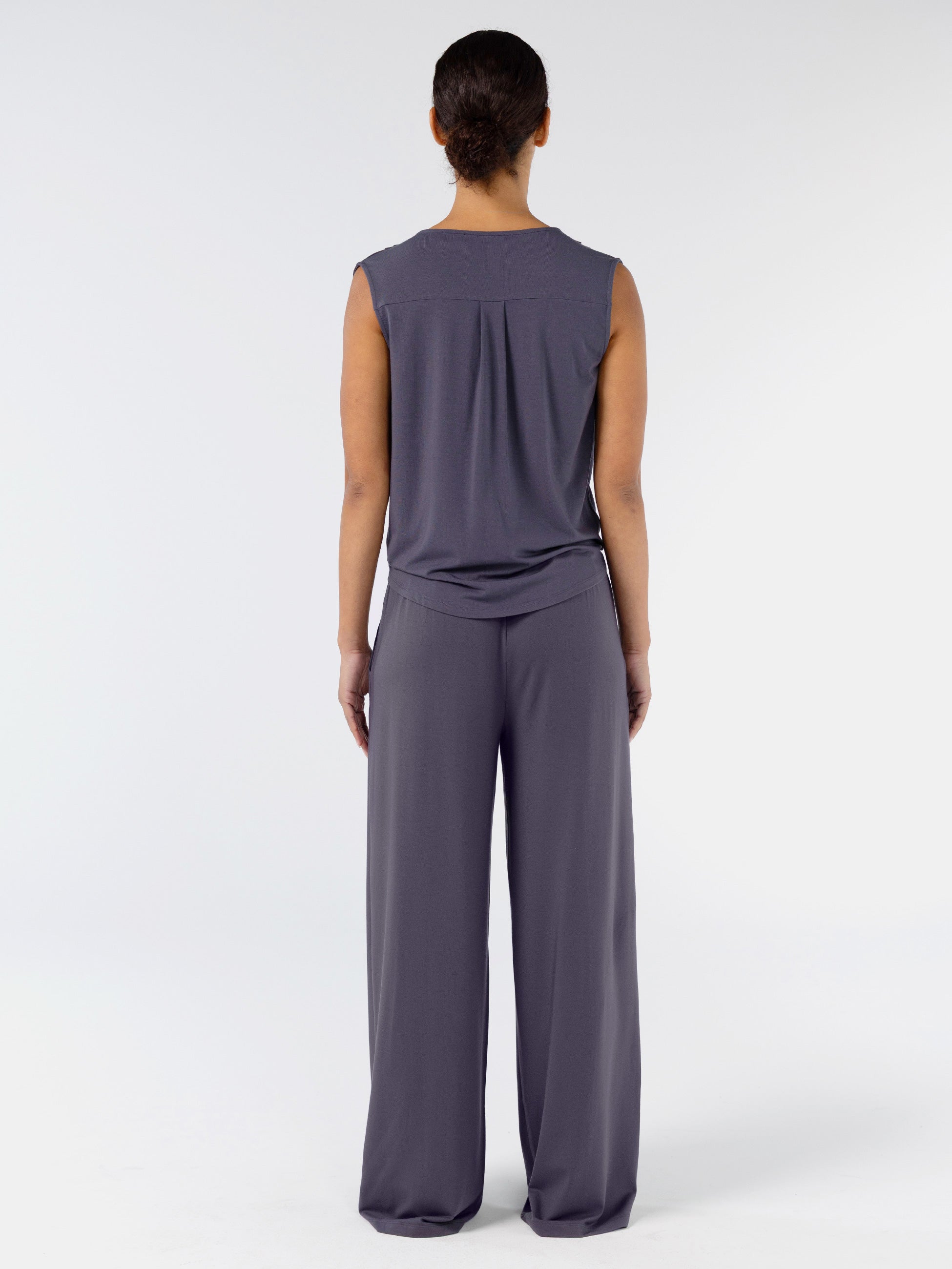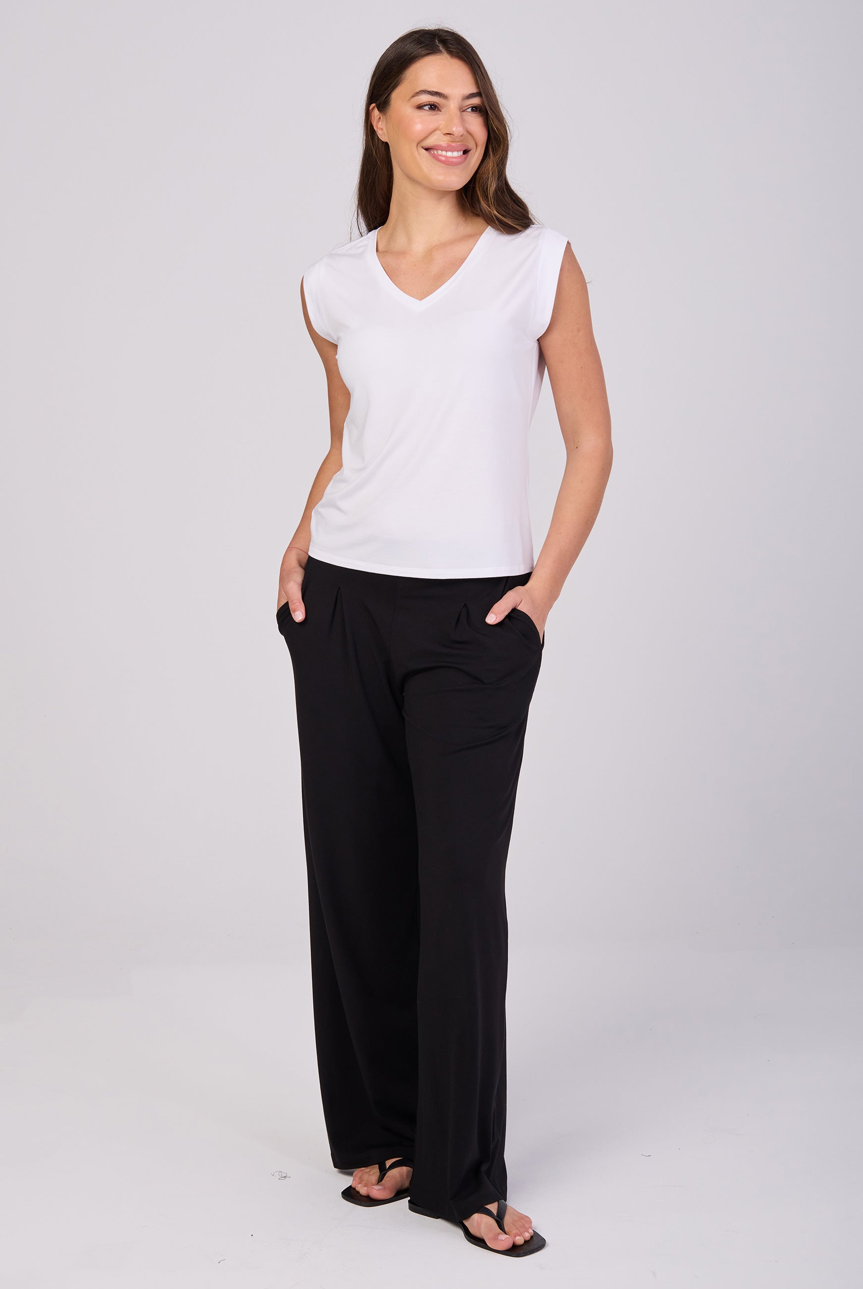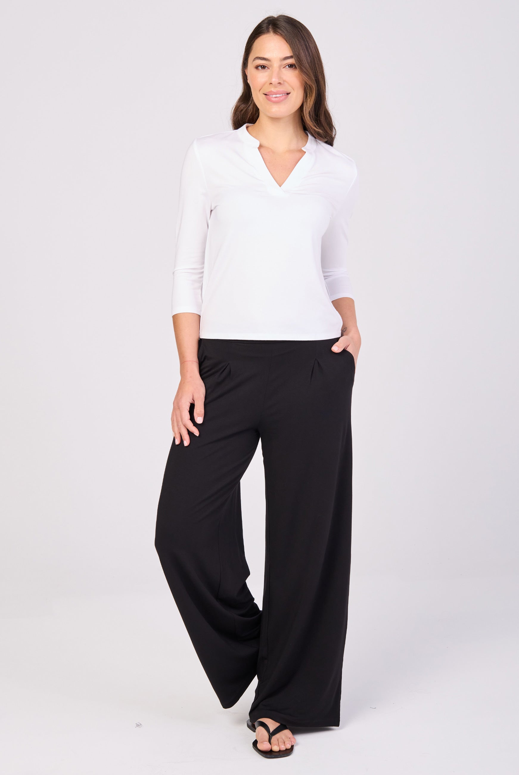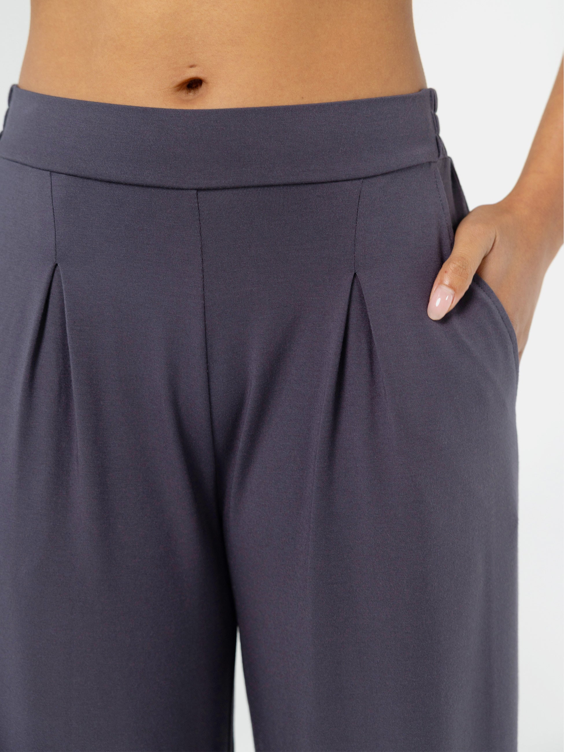 A relaxed yet elevated essential, the Wide Leg Pleat Front Pants offer effortless style and all-day comfort. Designed with a soft elastic half waist, pleat front detailing, and side pockets, they create a flattering drape while ensuring a flexible fit. The relaxed silhouette makes them a versatile staple, perfect for dressing up or down. These pants are a timeless wardrobe must-have, whether paired with a tailored top for a polished look or a casual tee for easygoing style.