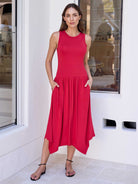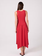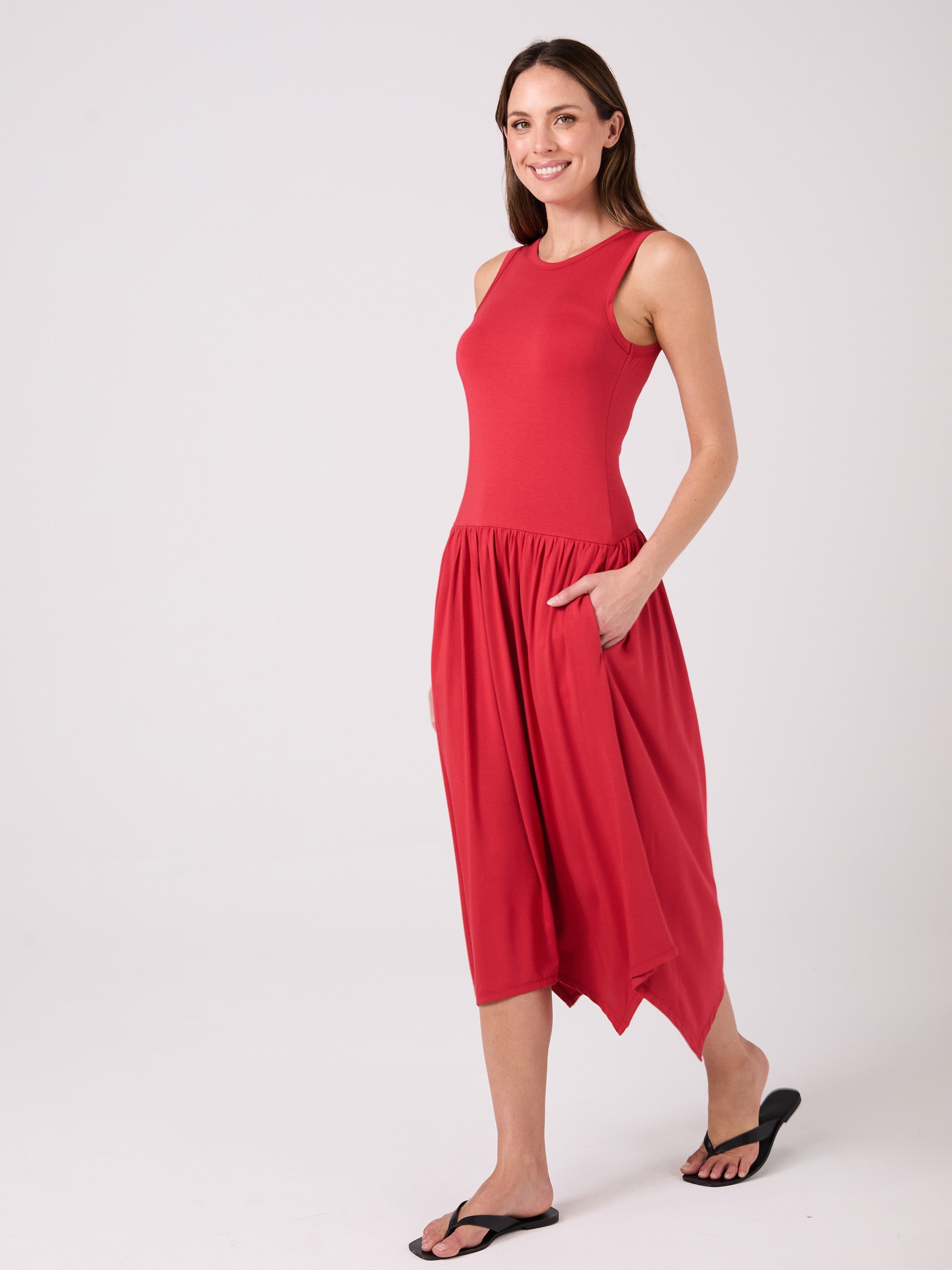 Crafted from an ultra-soft, breathable fabric, this sleeveless dress drapes beautifully for an effortlessly flattering fit. The dropped waistline creates a relaxed, easy silhouette, while the asymmetric hem adds a touch of modern edge and graceful movement with every step.