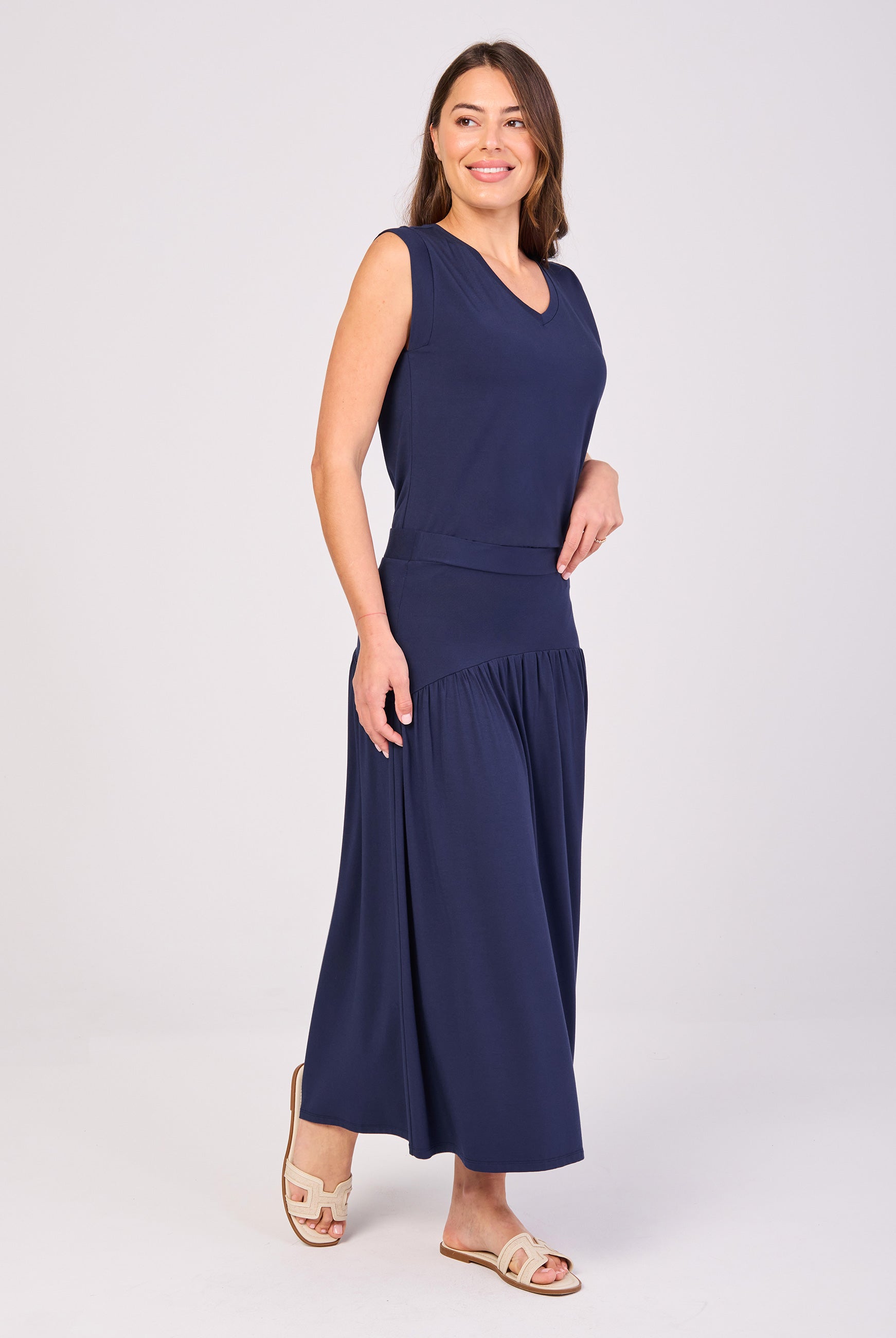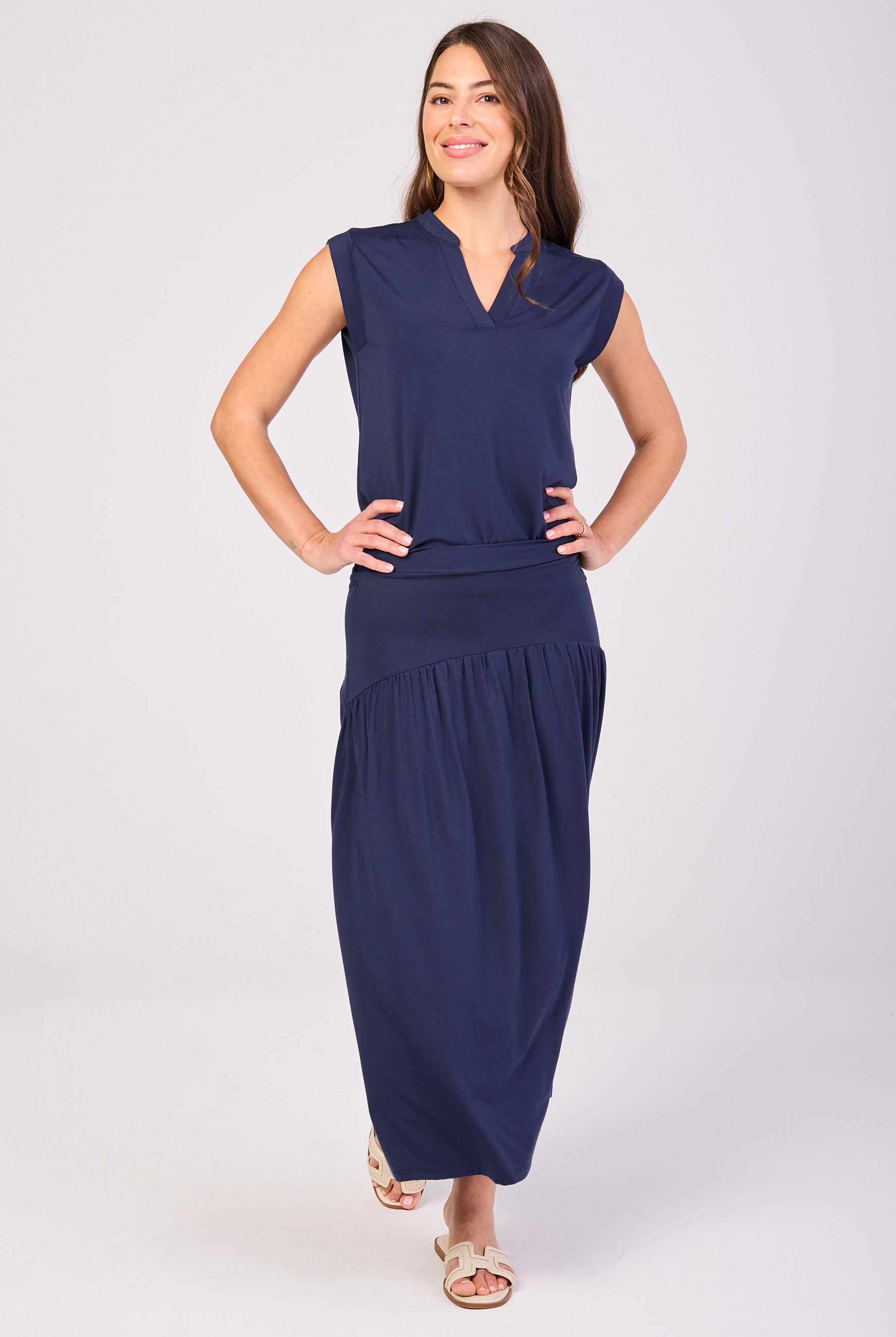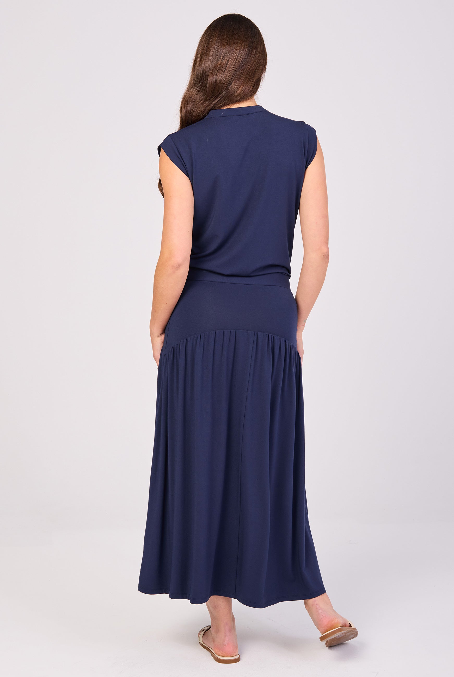 Designed with deep side pockets and a softly gathered waistline, this silhouette is flattering, functional, and endlessly wearable.