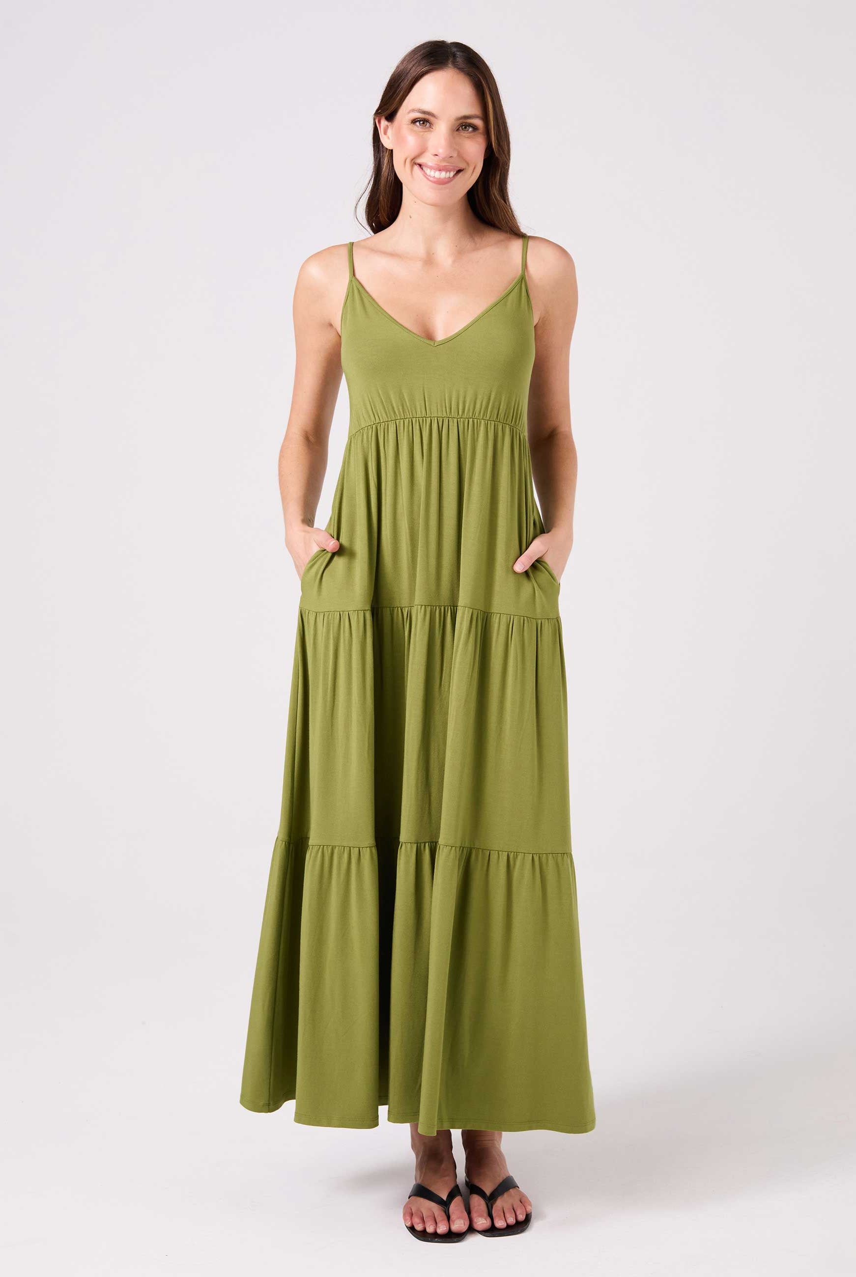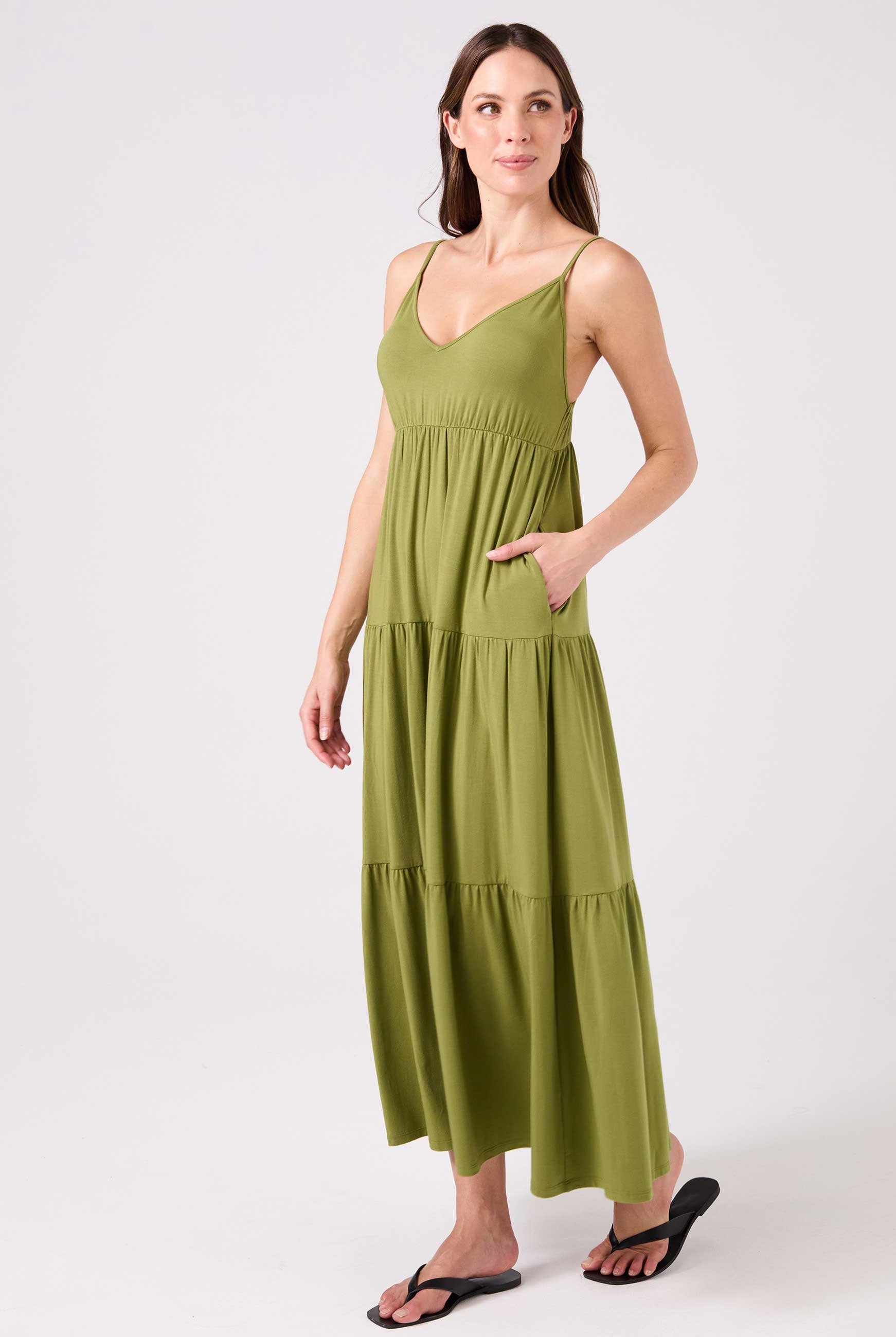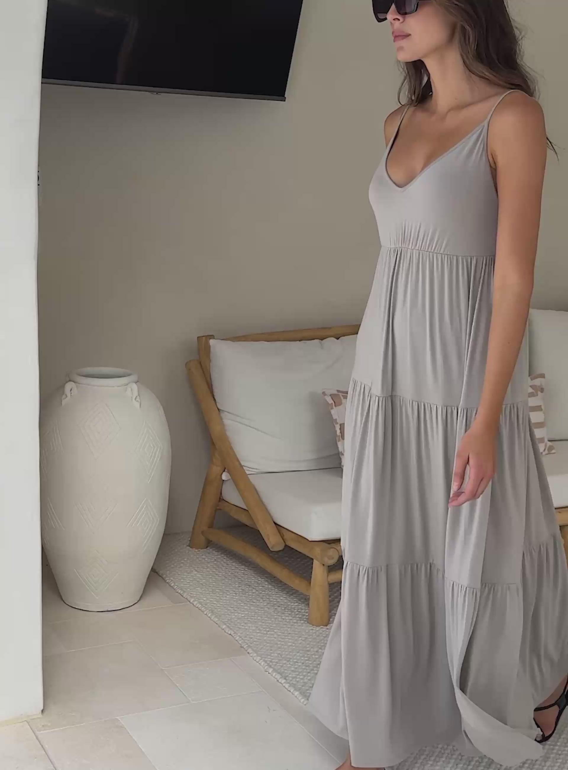 Elevate your everyday style with our V neck maxi dress. Perfectly balancing elegance and casual comfort, this clean and flowy tiered maxi offers effortless movement, a flattering silhouette, and convenient side pockets. Crafted from soft, sustainable Lenzing Modal, it's ideal for any activity. Pair it with sandals for a chic look or sneakers for a laid-back vibe. This versatile dress is your go-to for any occasion.