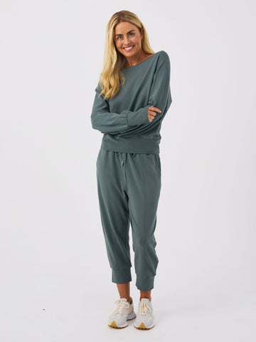 I wasn't quite sure what 'french terry' material was but it looks very similar to my Dharma Bums Nomad Relax pants, but a bit thicker. The longer short sleeves are perfect to hide upper arms and the top sits very well and stays in place (ie doesn't fall down!). Love the stylish look when teamed with the Relax pants. I got the XS (I'm a size 8-10).