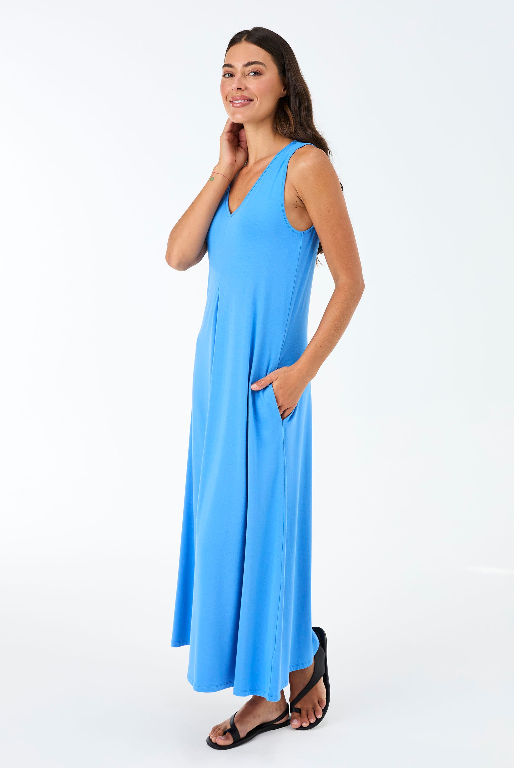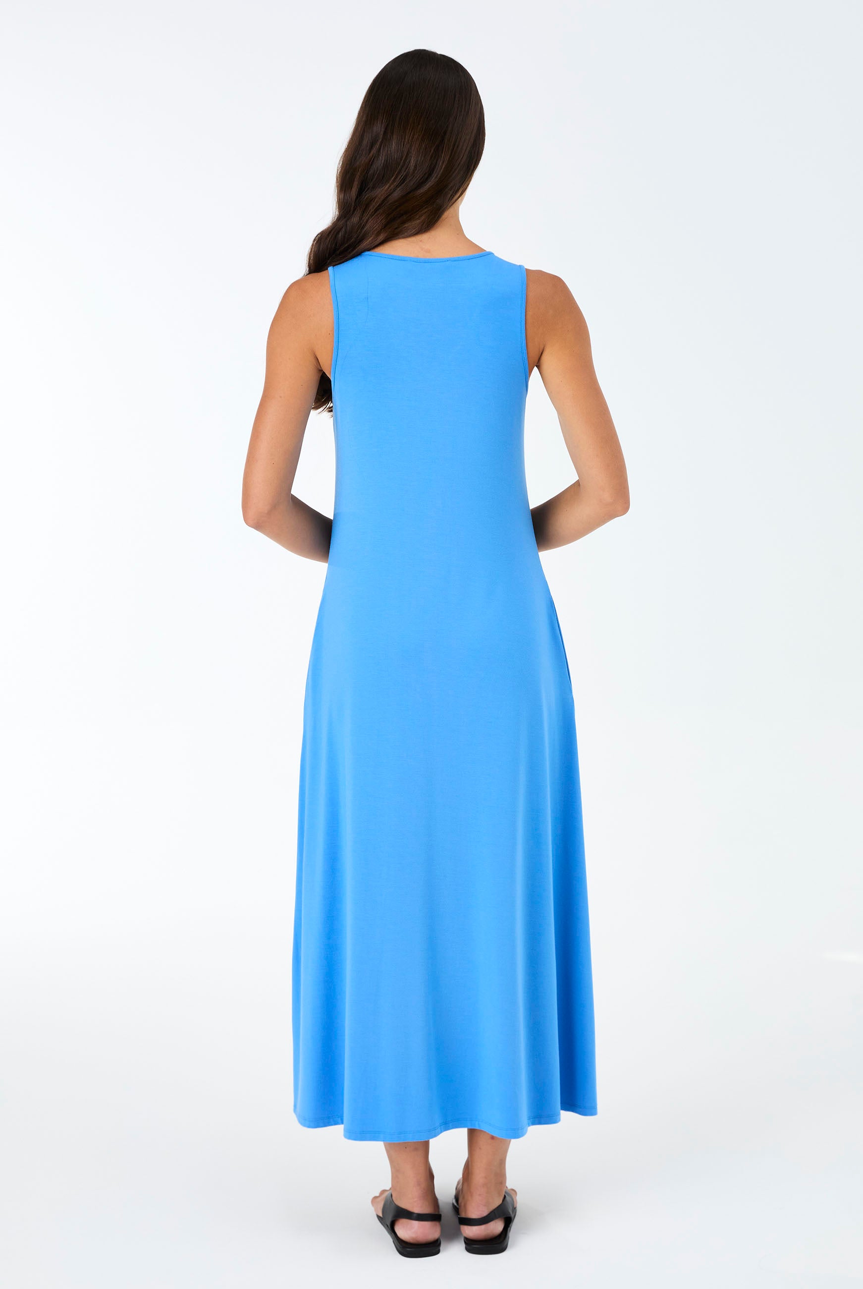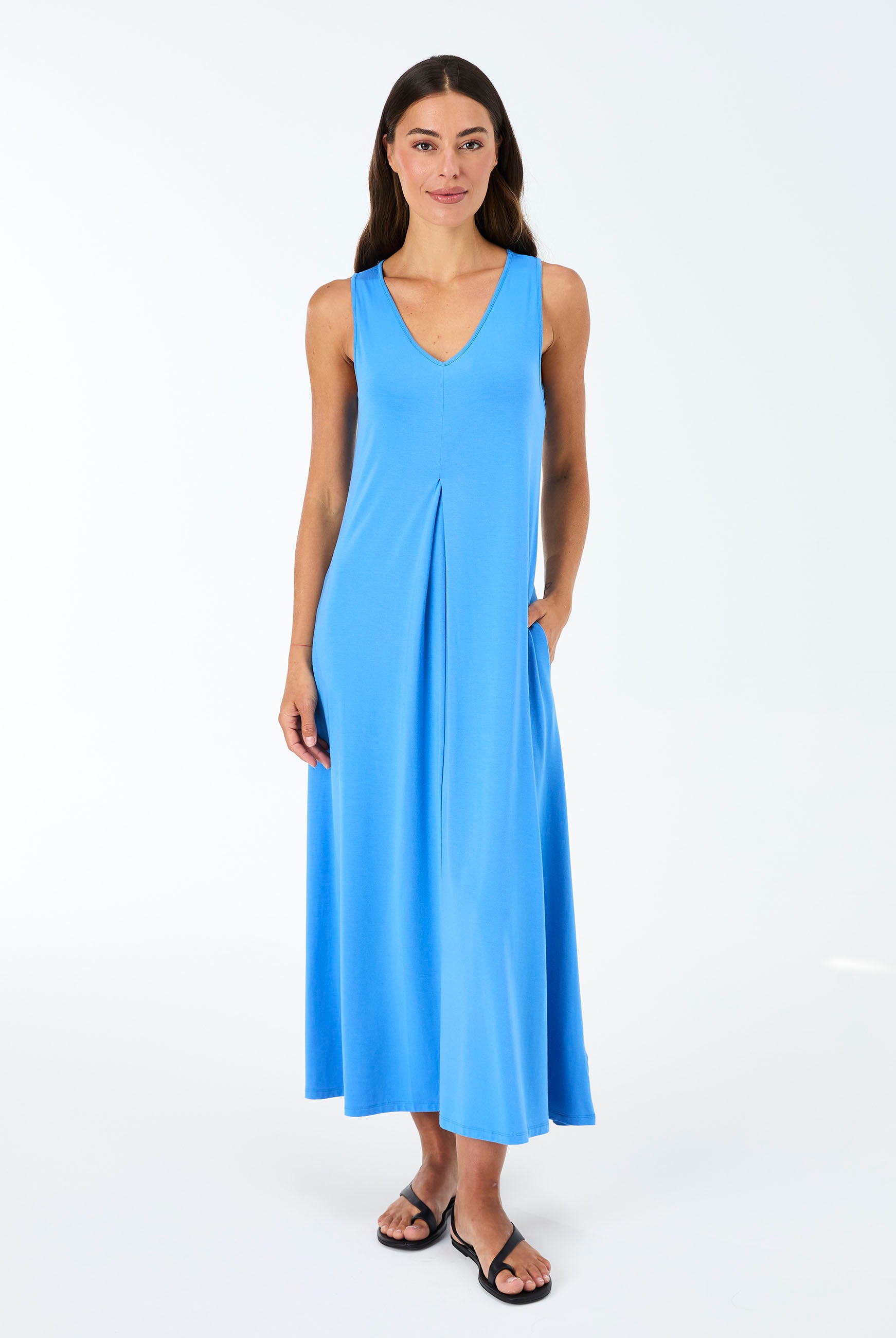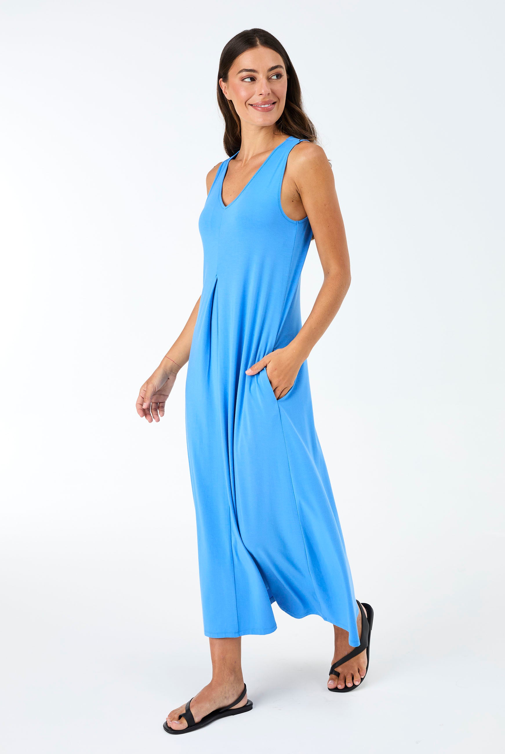 Effortless and refined, the Dionee Dress features a soft front pleat, sleeveless silhouette, and a flattering midi length that falls to the calf. Designed for ease of dressing, it offers a gentle drape with a soft, comfortable feel against the skin. An elegant everyday piece made to move seamlessly from day to night. Dress front length 121cm