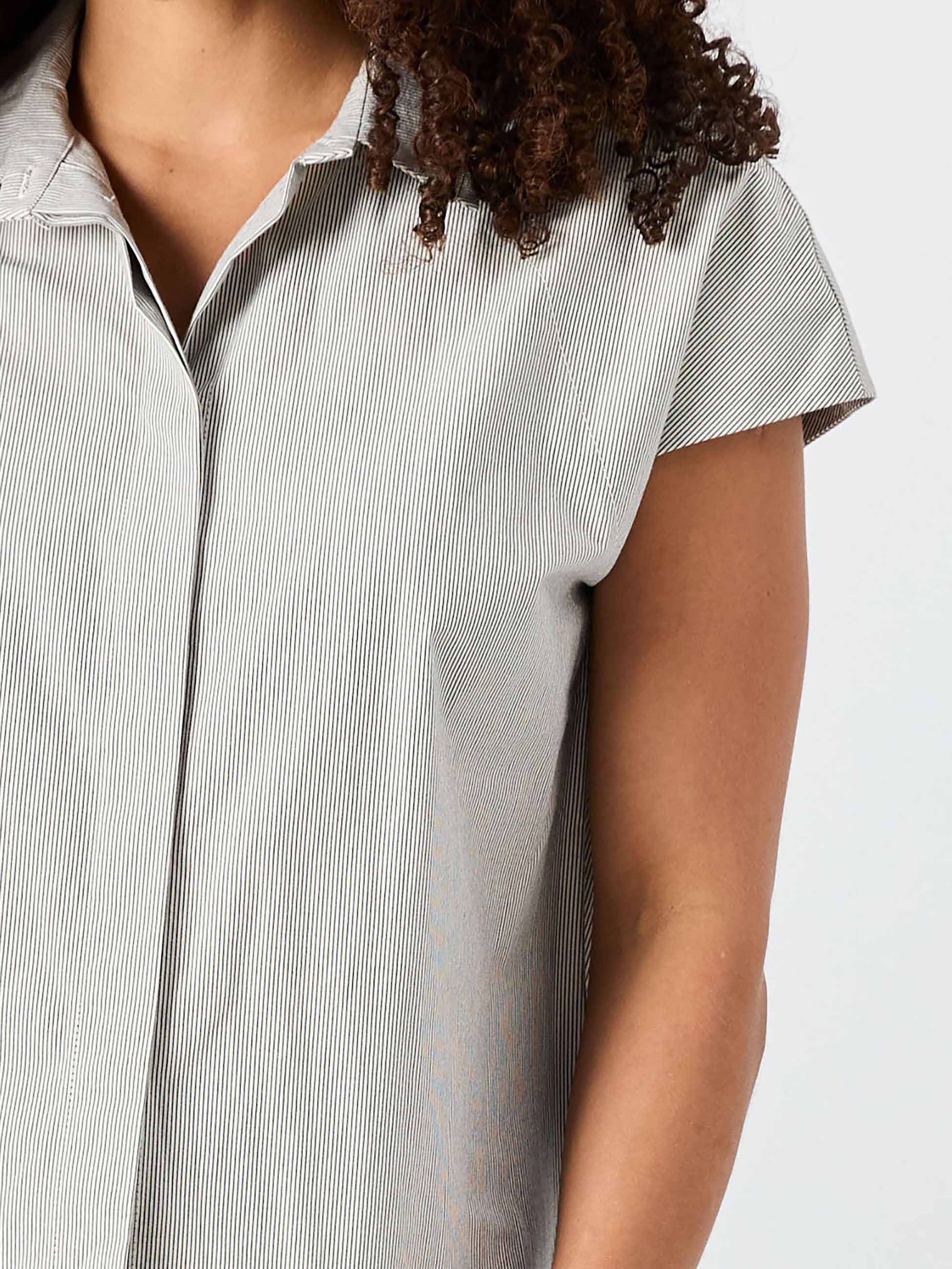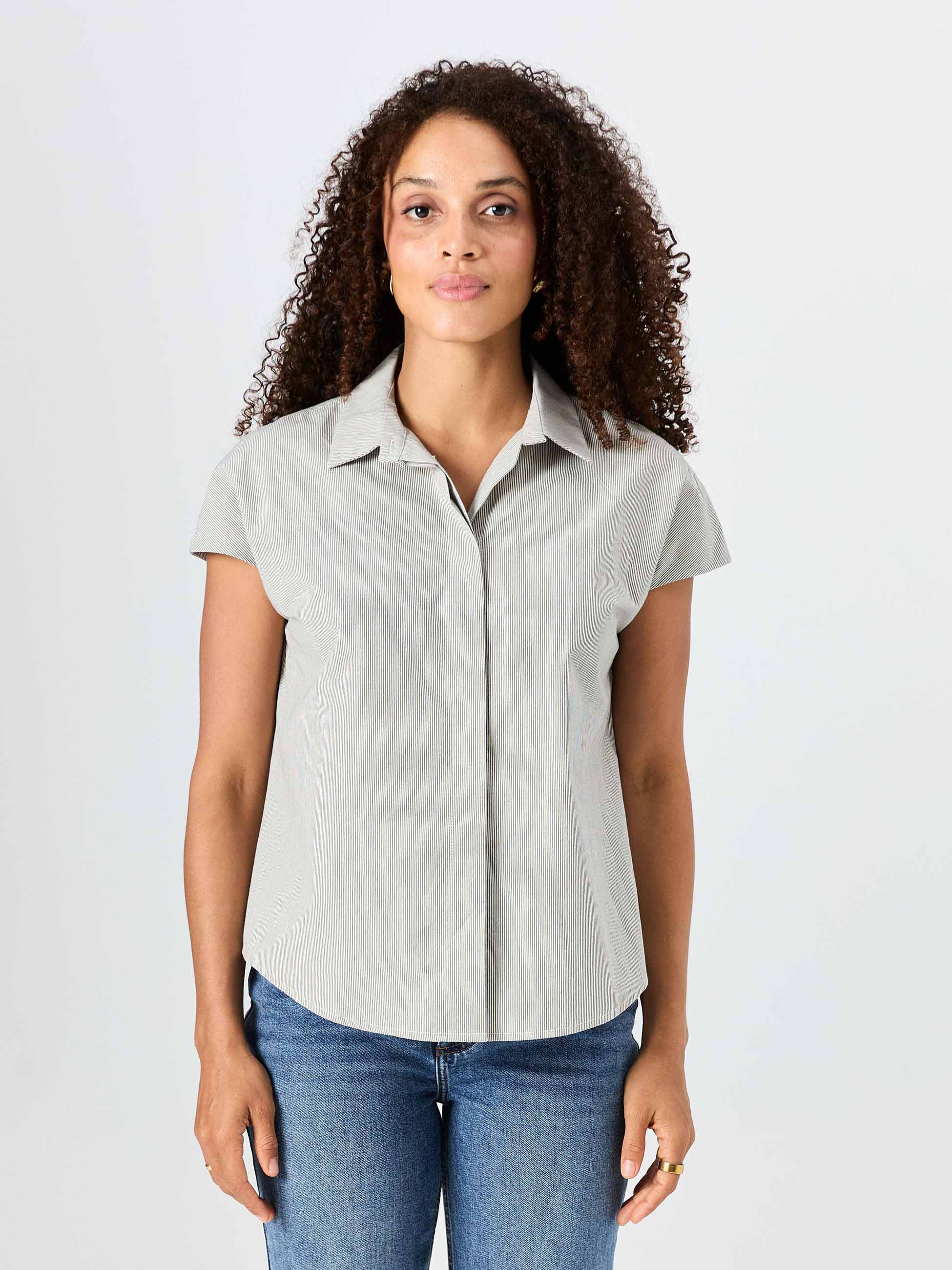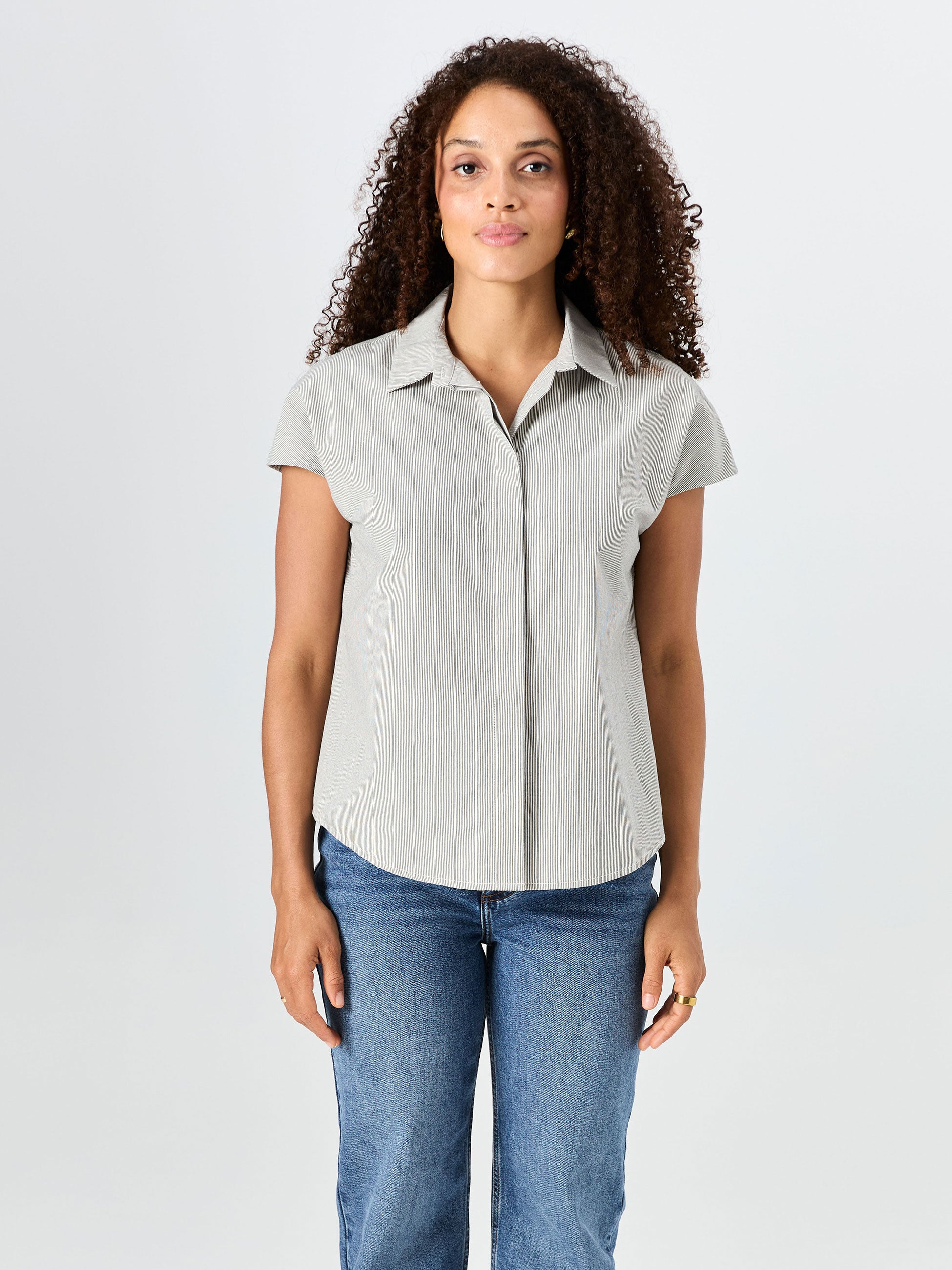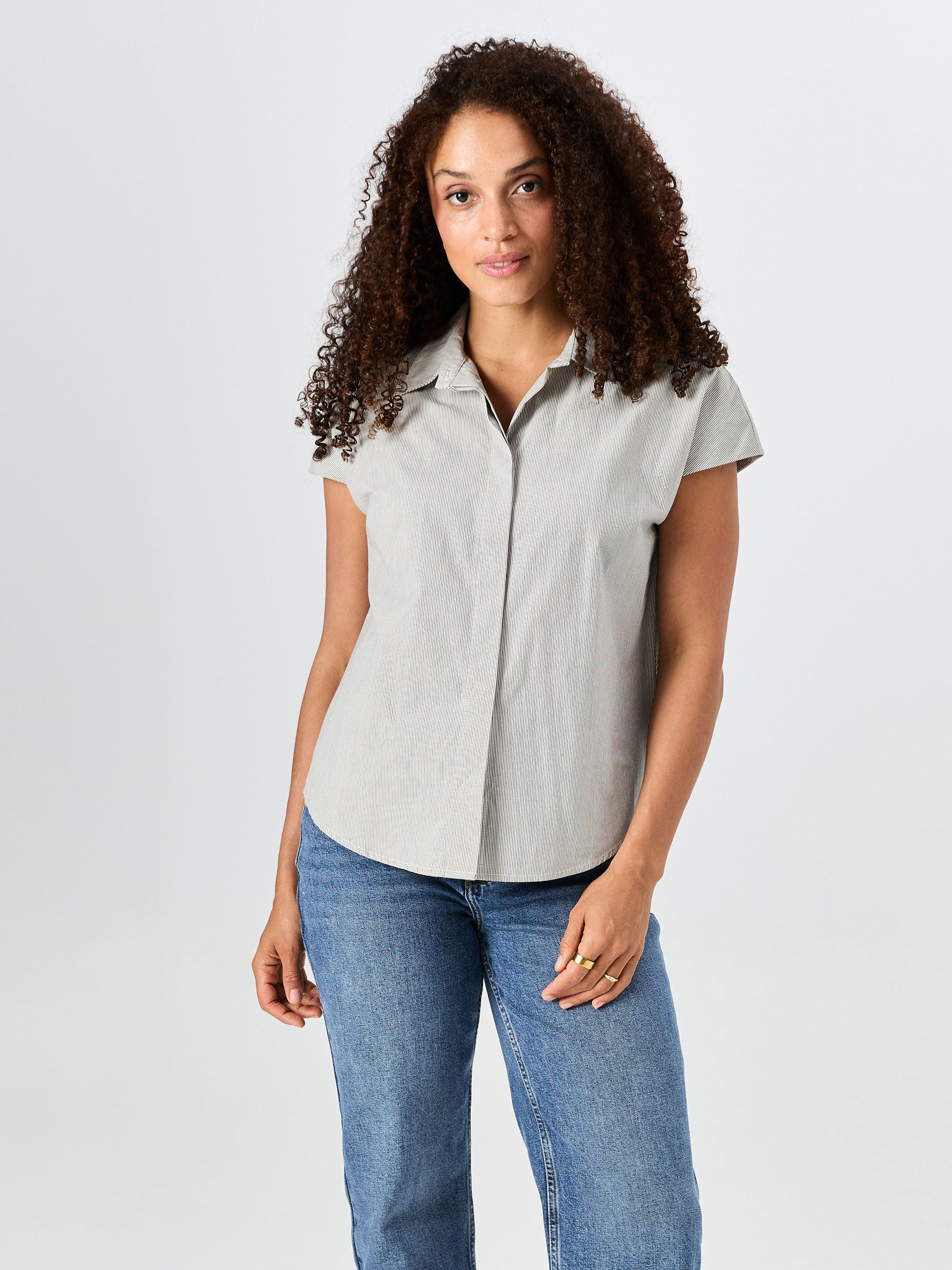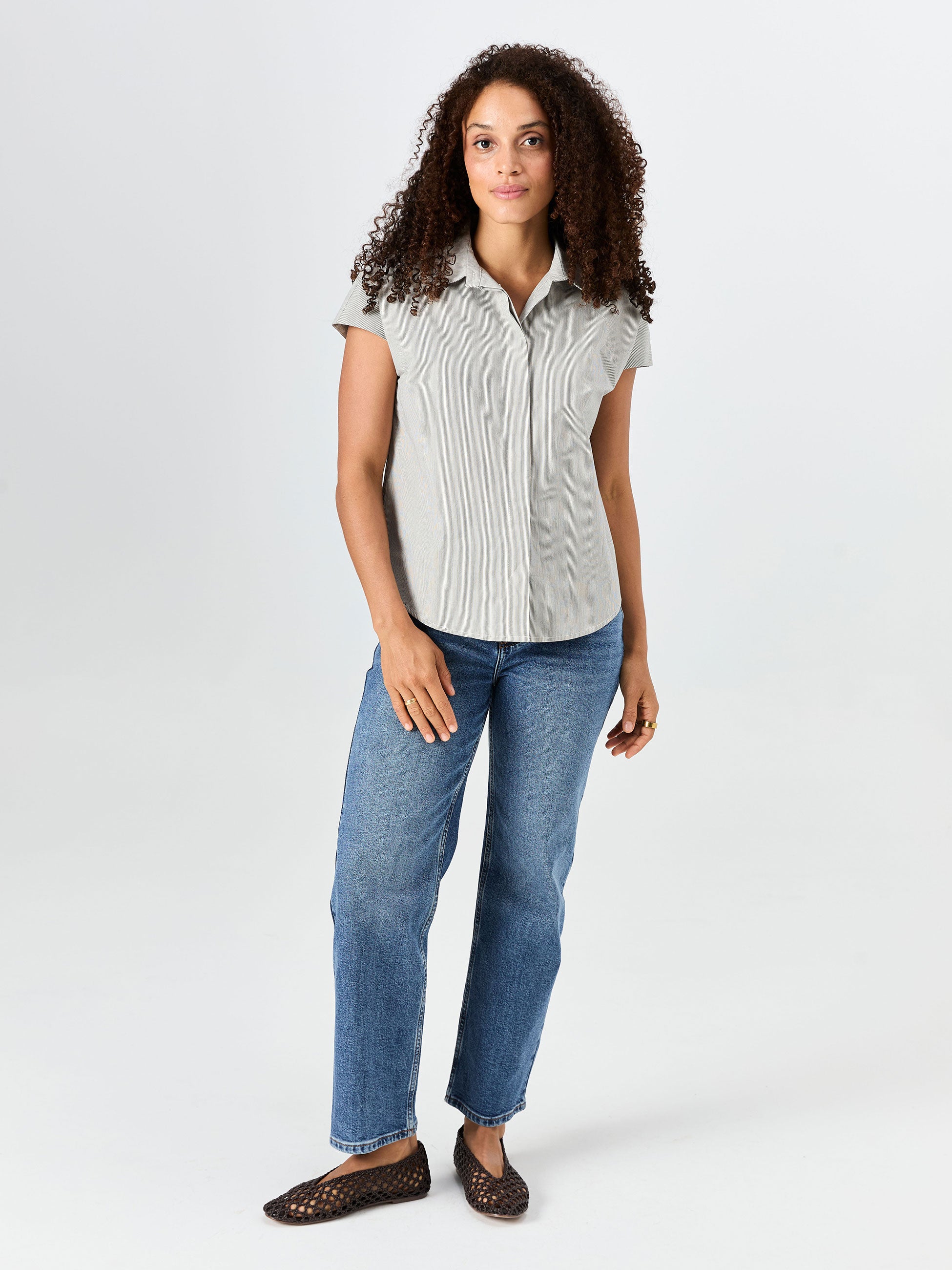 The Laurel Poplin Shirt is the kind of piece you reach for without thinking. Crisp, clean, and cut in a relaxed fit that feels easy from the moment you put it on. The high neck collar and button-through front give it a polished edge, while the adjustable detailing means you can wear it exactly how you like.