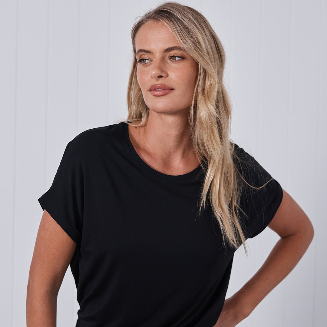Made from ultra-soft micromodal with a hint of stretch, this tee moves with you and melts against your skin. It’s that just-stepped-out-of-a-dream kind of soft.
