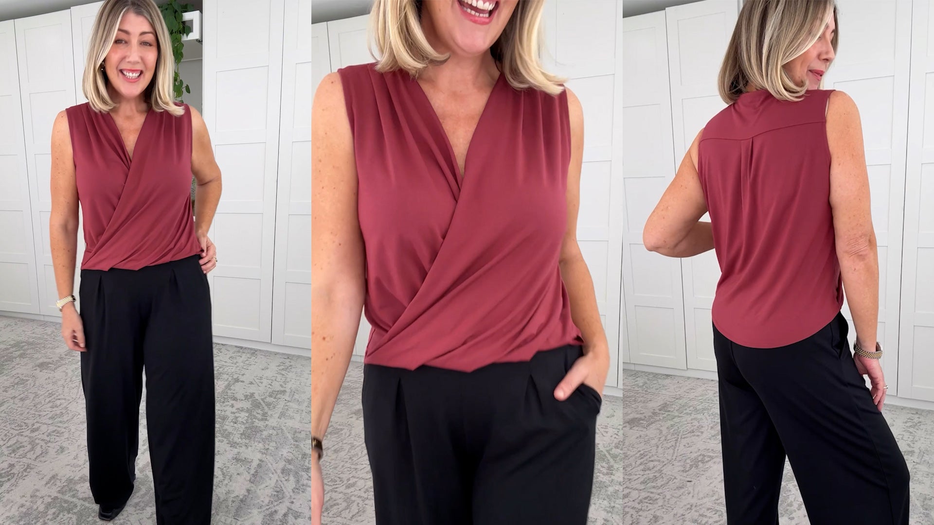 Natalie Angel pairs the Best selling 𝗙𝗿𝗼𝗻𝘁 𝗣𝗹𝗲𝗮𝘁 𝗣𝗮𝗻𝘁𝘀 with Most-loved Athena Drape Top — Everyday, Easy wear & Effortless wardrobe.