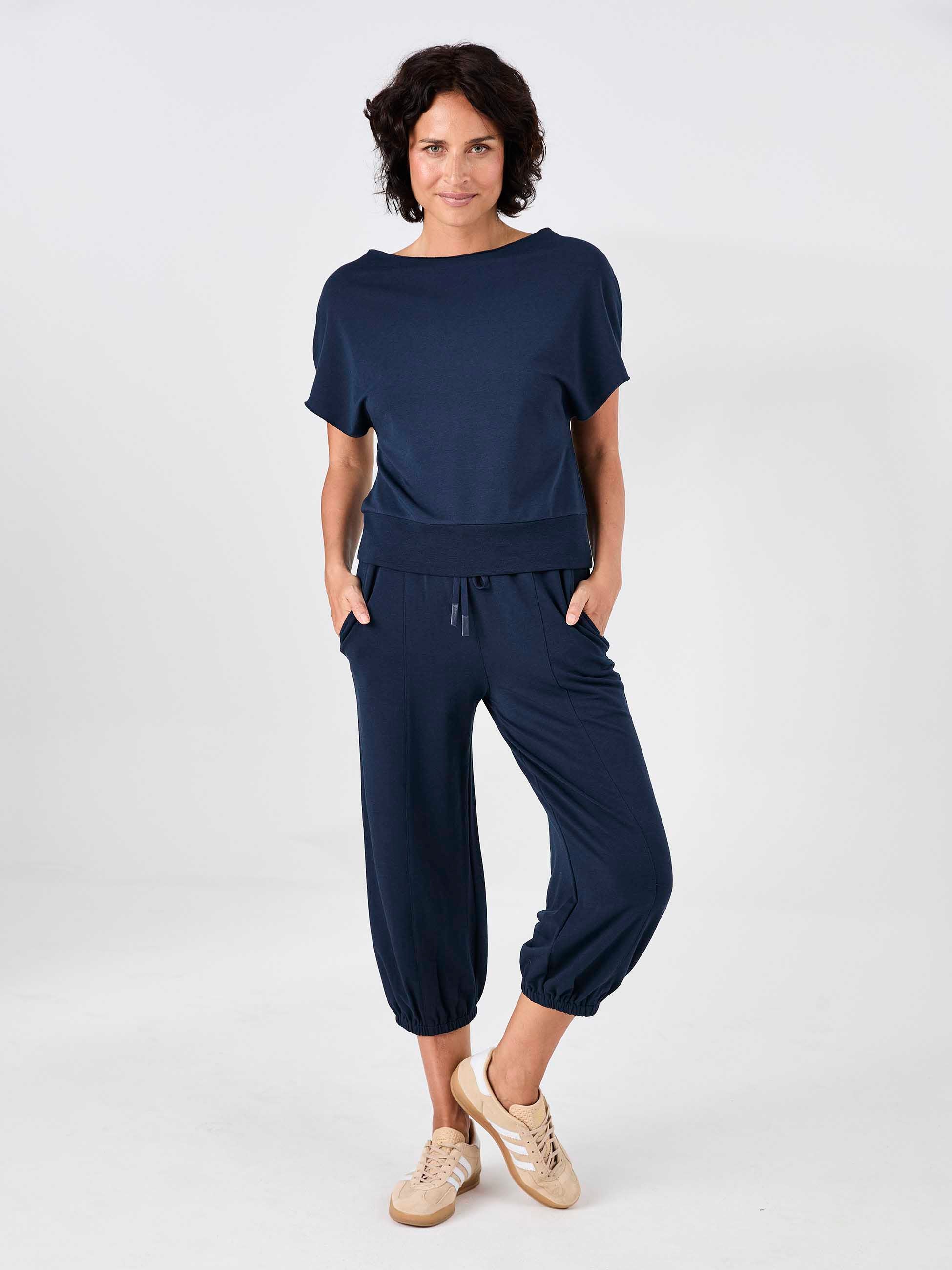 Crafted from our signature butter-soft fabric, the Dune Sweat Pant delivers next-level comfort with a polished, everyday silhouette. Designed in a flattering 7/8 length with a softly tapered leg and cuffed ankle, it’s relaxed — but refined.  A soft elastic waistband with adjustable drawcord ensures the perfect fit, while functional back pockets elevate the look, giving you the structure of a pant with the ease of a sweat.  It’s the piece you’ll reach for when denim feels too rigid and leggings feel too casual.