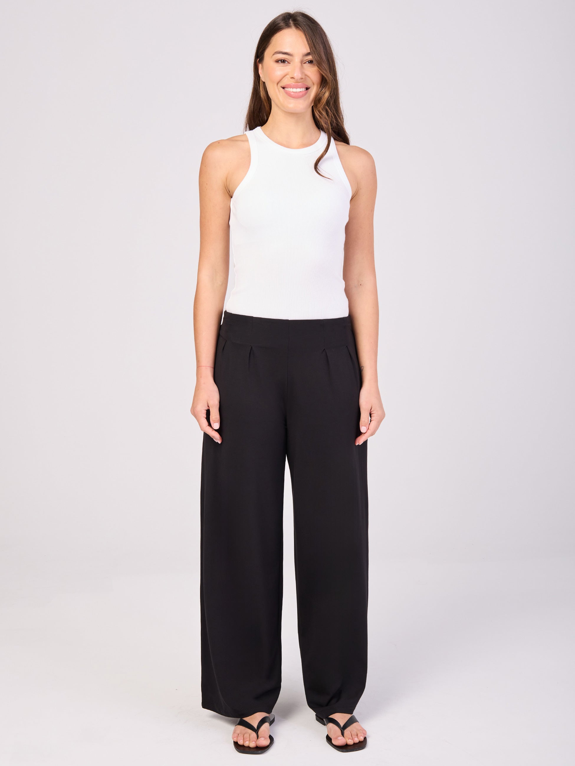 Featuring a flat front waistband for a sleek, structured look and an elasticated back for all-day ease, the Emery Pant blends polish with practicality. Deep front pleats and a high, flattering waistline create a lengthening effect,