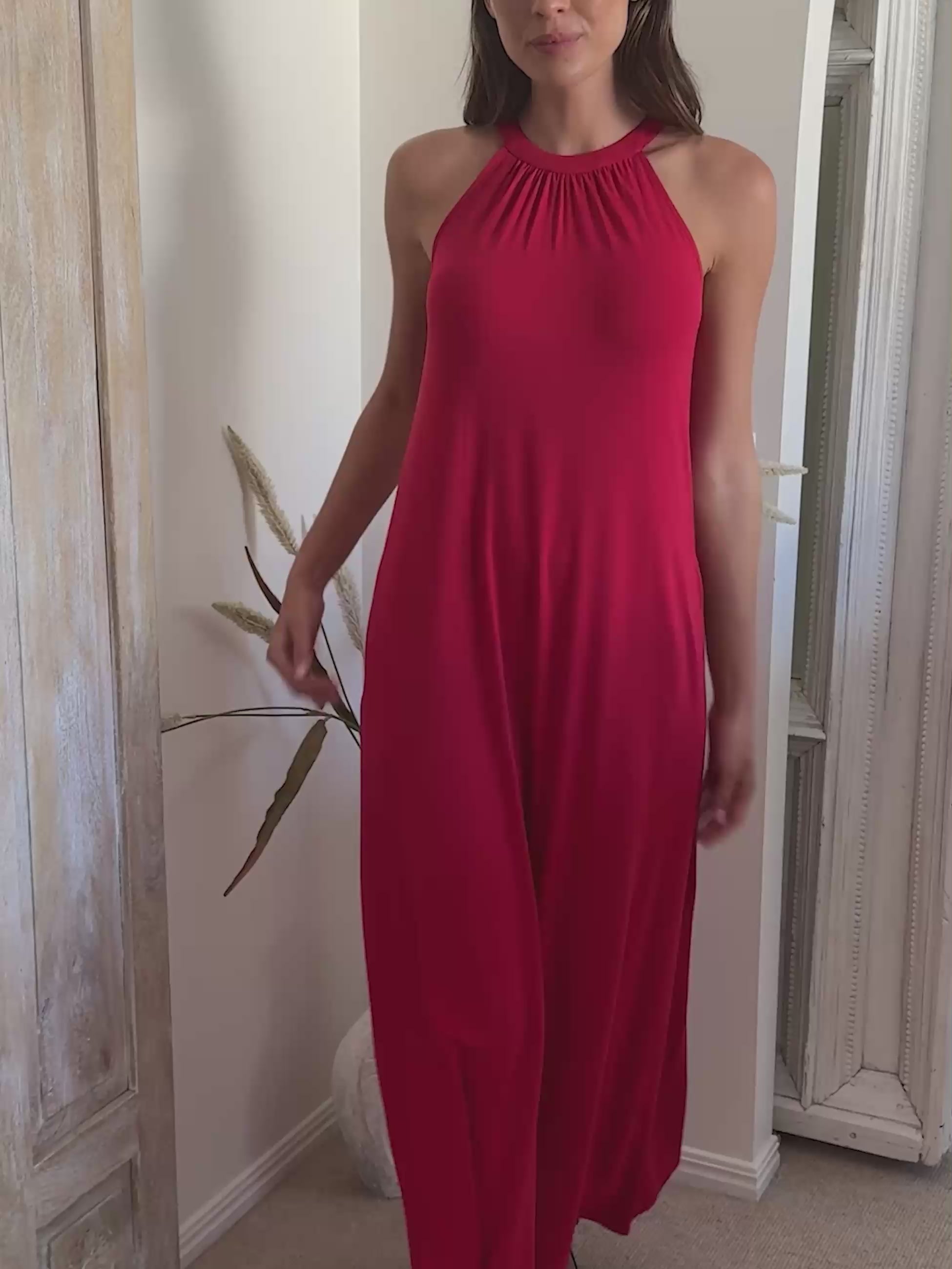 Beautiful dress, falls beautifully from the halter neck, doesn’t cling just falls softly