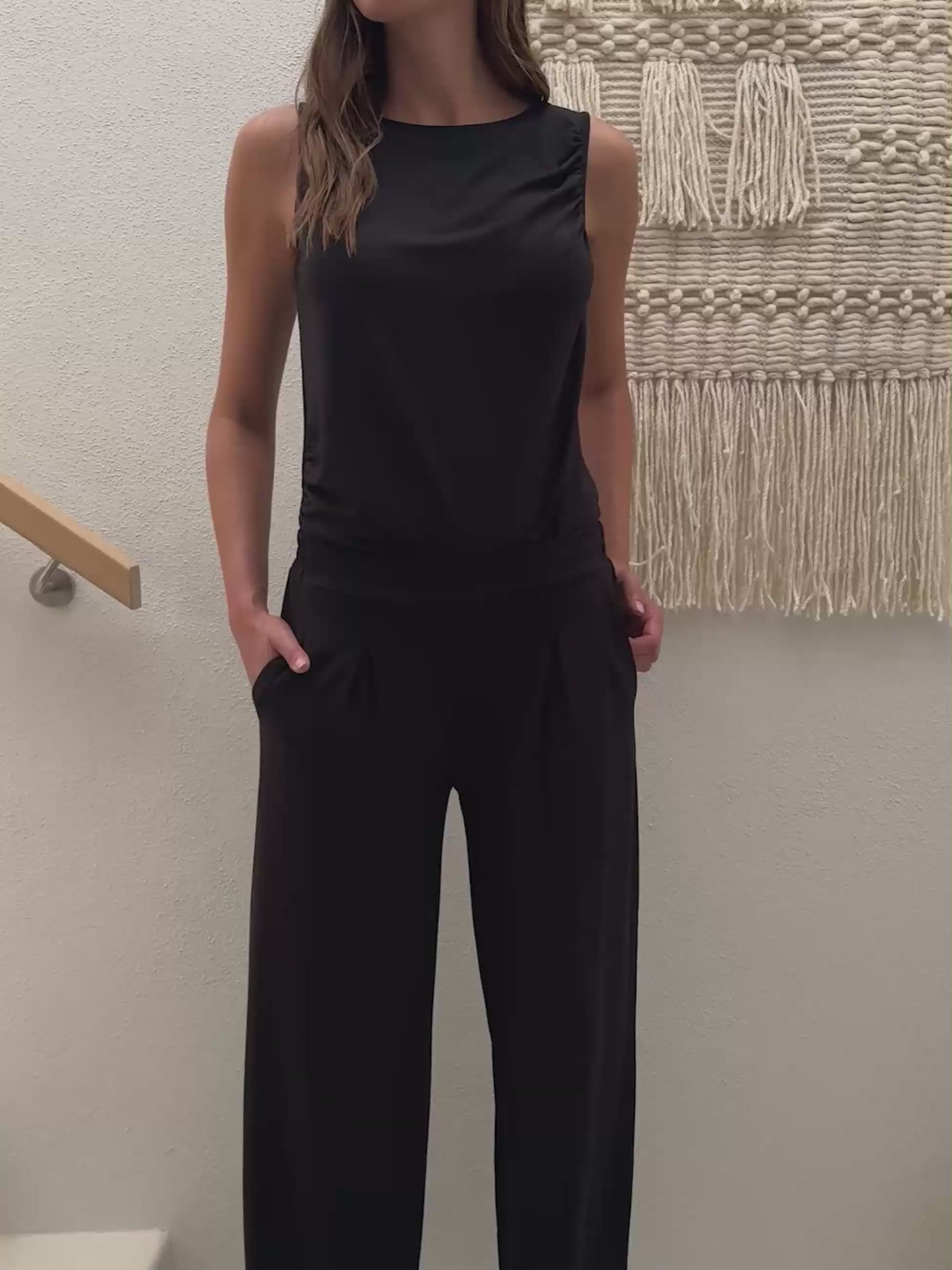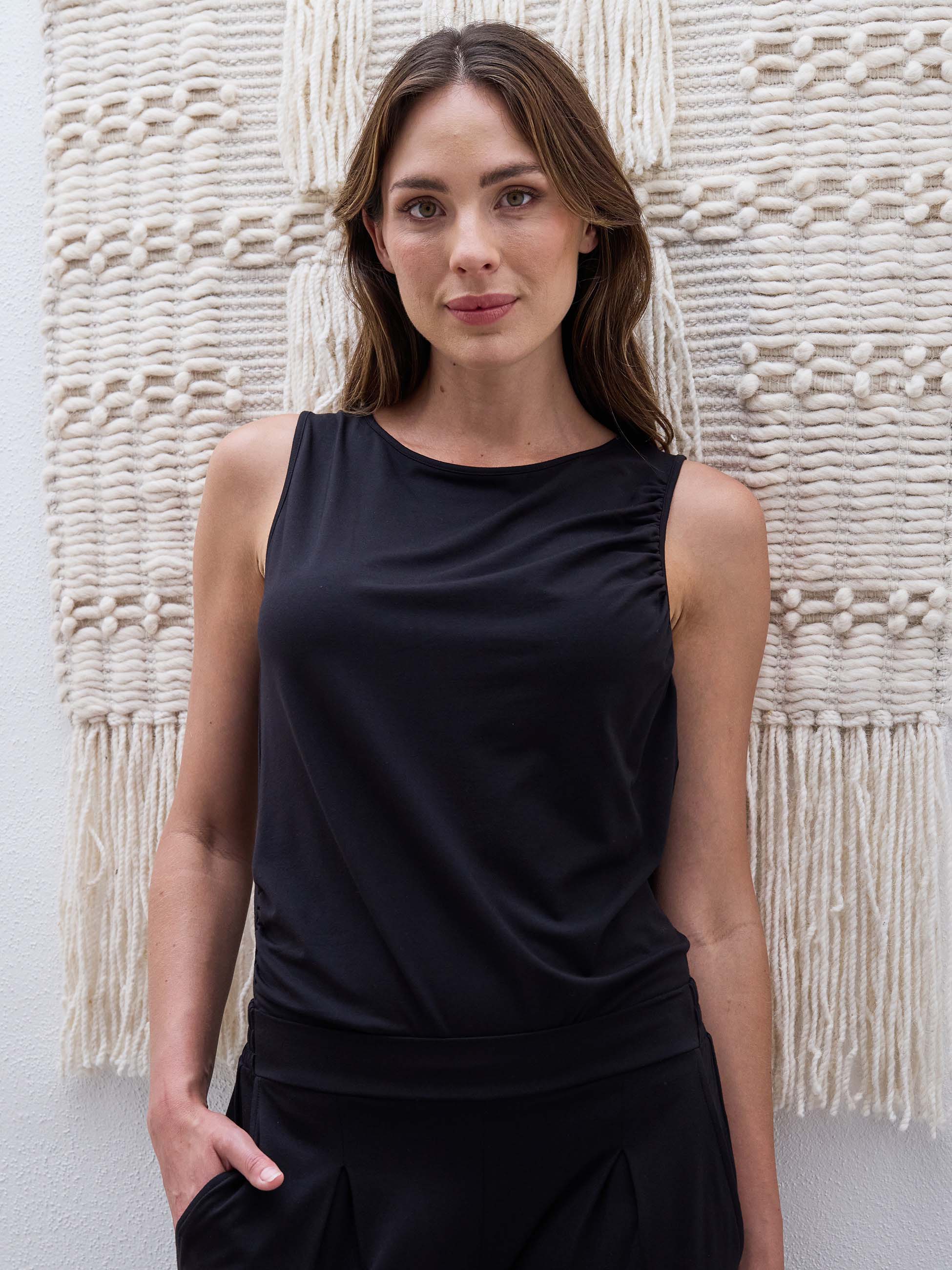 Effortlessly elegant and endlessly versatile, the Kamal Top is crafted for comfort and ease. Designed with delicate gathers along the sides and around the armholes, it creates a soft, flattering drape that moves beautifully with you. The sleeveless silhouette and high neckline lend a refined, modern edge — perfect for layering or wearing on its own.