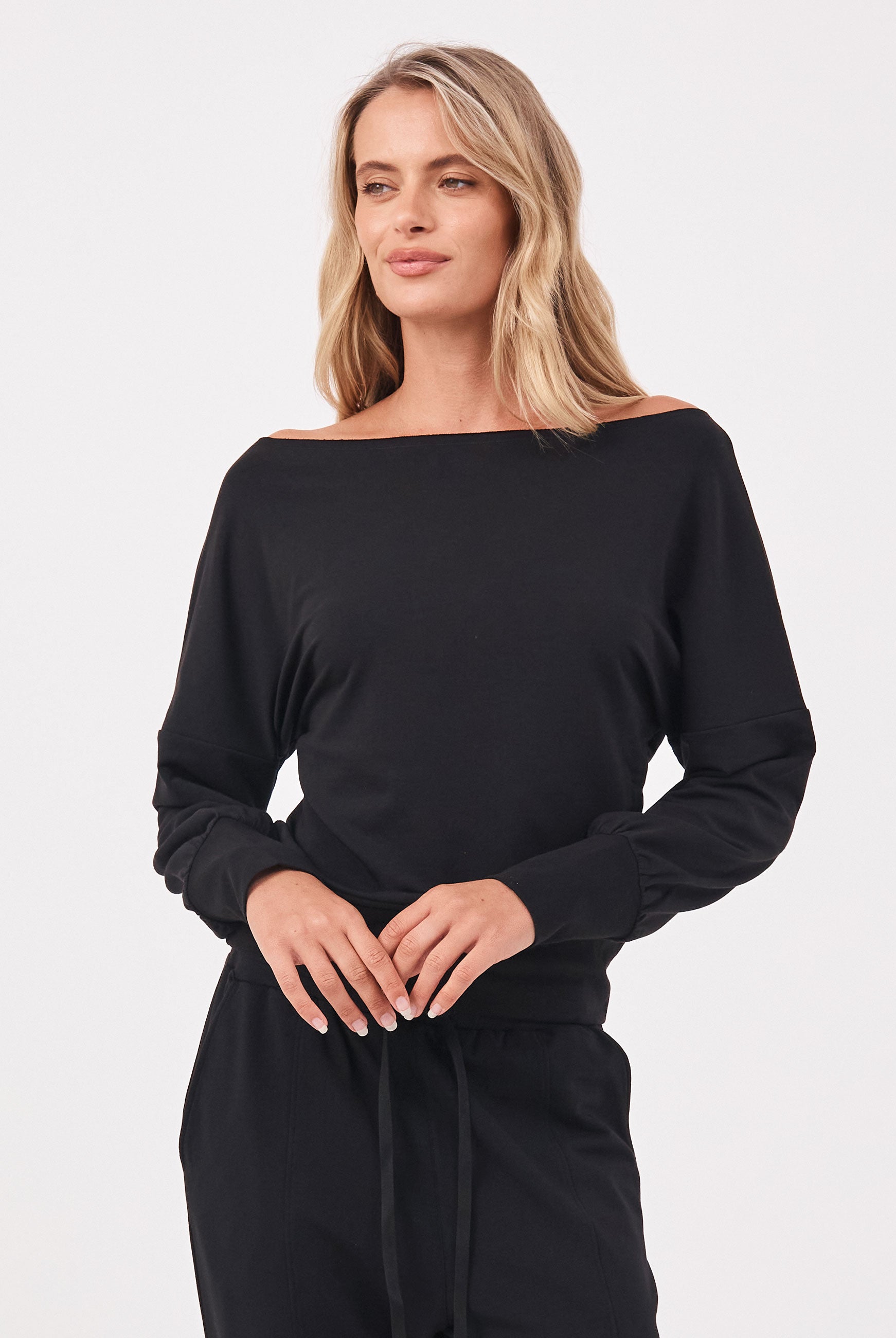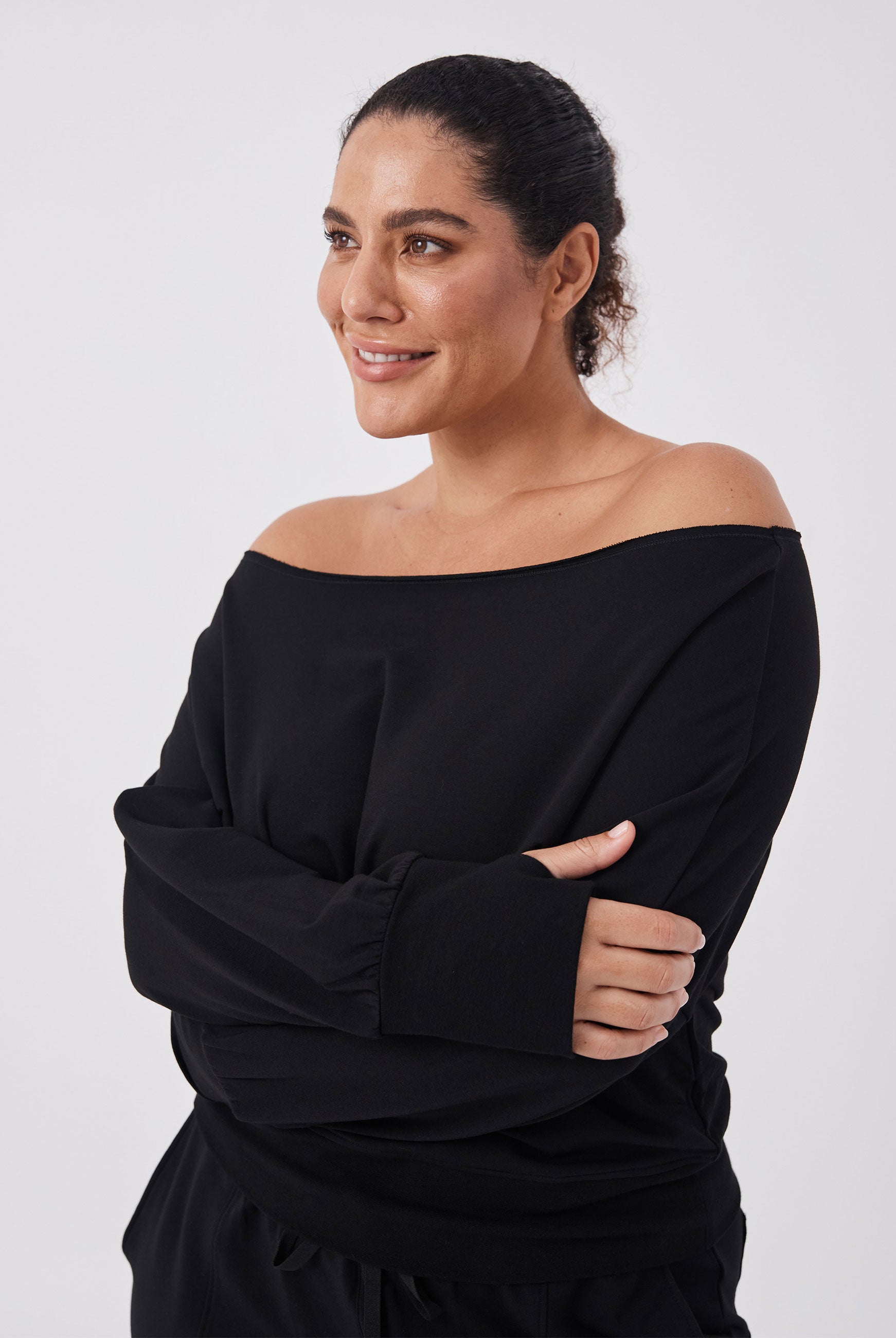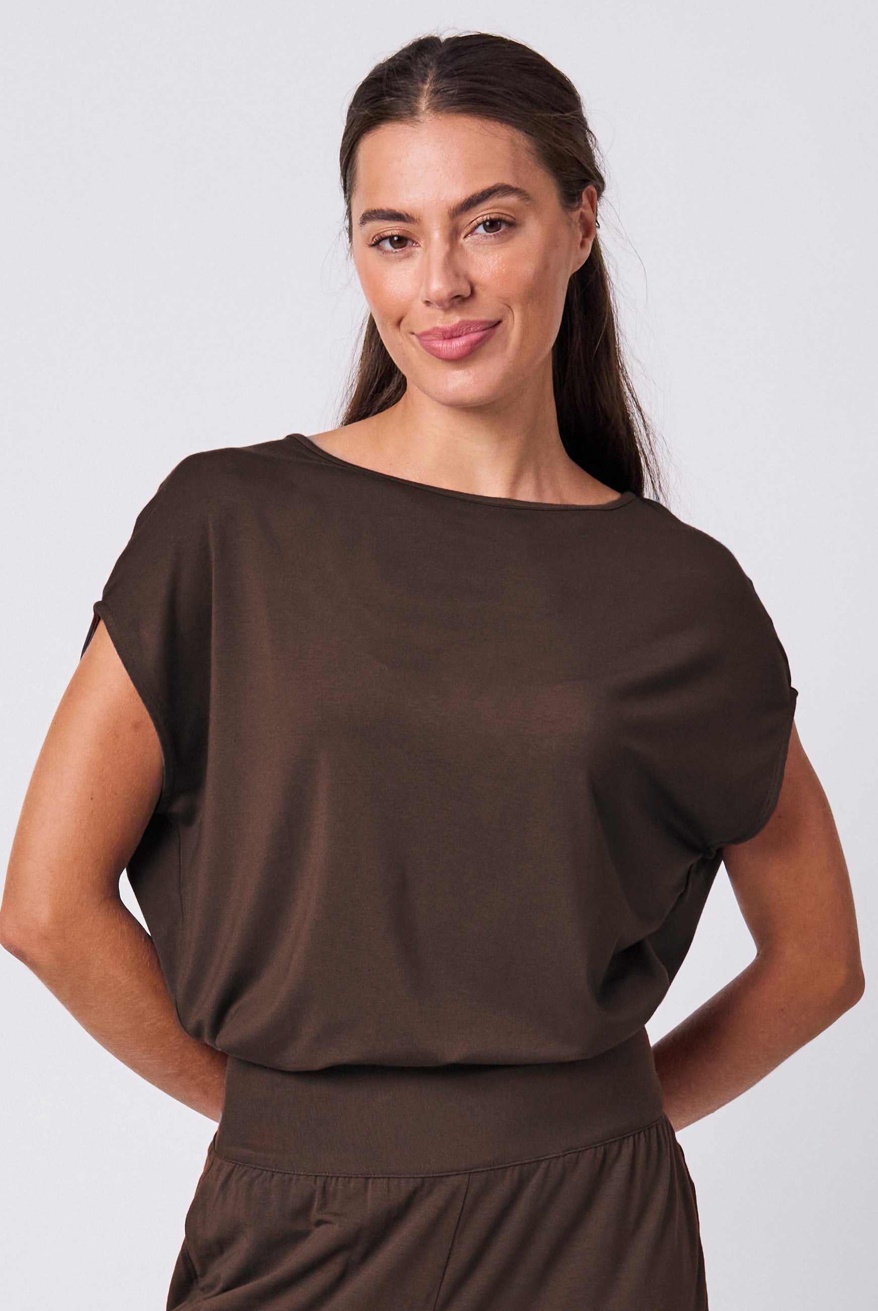 Relaxed through the chest/shoulders with a gentle drape, then narrows at the hem to sit snugly on the hips; flattering on pear shapes and those wanting tummy coverage. Roomy enough for busty wearers; a few sized up for an intentionally slouchy, draped look.