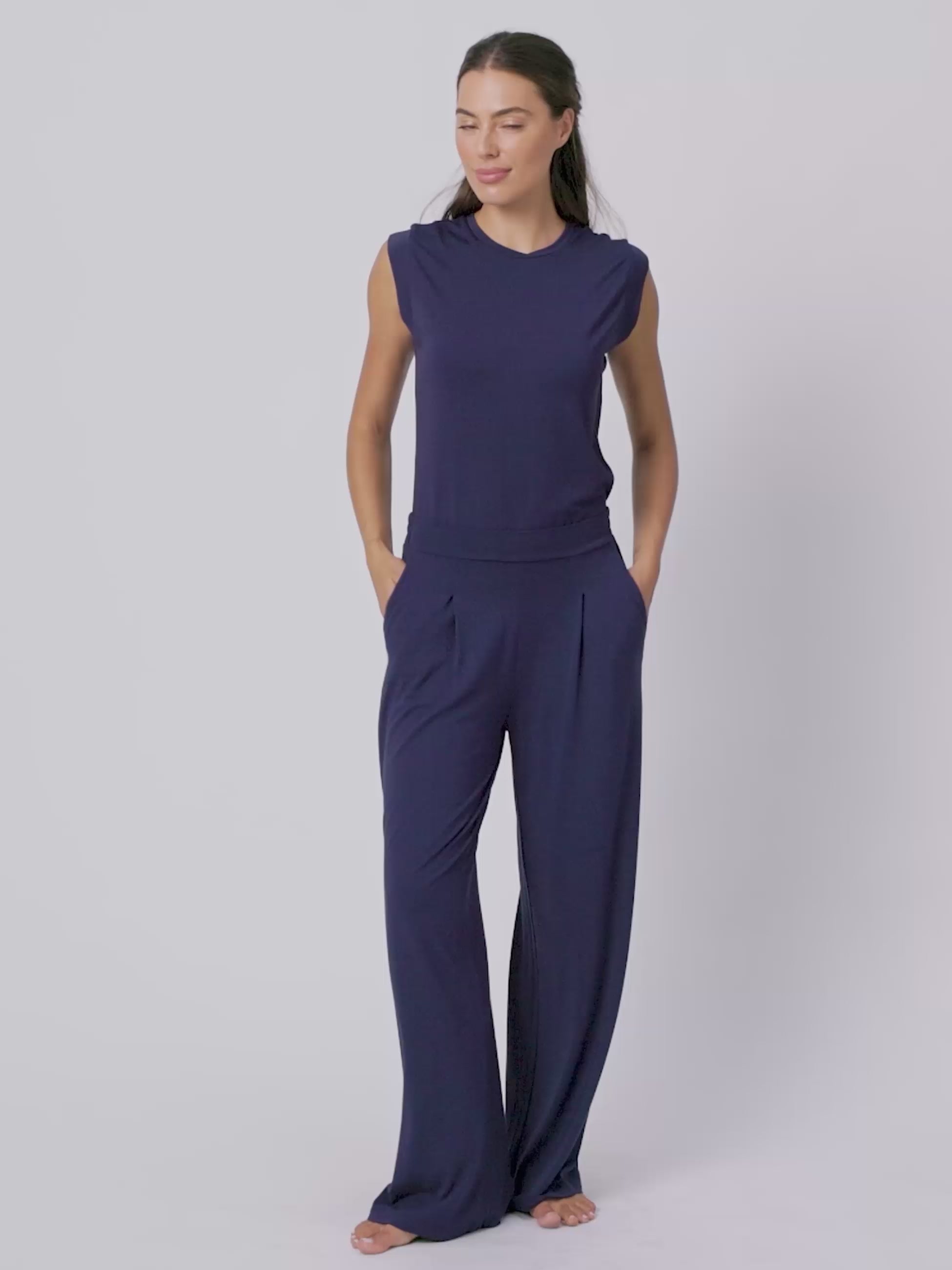 A relaxed yet elevated essential, the Wide Leg Pleat Front Pants offer effortless style and all-day comfort. Designed with a soft elastic half waist, pleat front detailing, and side pockets, they create a flattering drape while ensuring a flexible fit. The relaxed silhouette makes them a versatile staple, perfect for dressing up or down. These pants are a timeless wardrobe must-have, whether paired with a tailored top for a polished look or a casual tee for easygoing style.