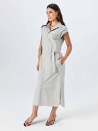 The Poplin Shirt Dress is the kind of piece that just works. Relaxed through the body with a high neck collar and clean button-through front, it sits at midi length with a side split that adds just enough ease of movement. The waist tie lets you shape it to you, or leave it loose on days when that's exactly what you need.