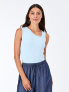 Refresh your everyday wardrobe with this modern essential. Made from ultra-soft 100% organic ribbed cotton, this tank features a striking asymmetric neckline for a subtle edge. Designed to flatter with a close, comfortable fit, it’s breathable, sustainable, and perfect for all-day wear. Style it solo or layered for effortless versatility—Front Length 56cm.