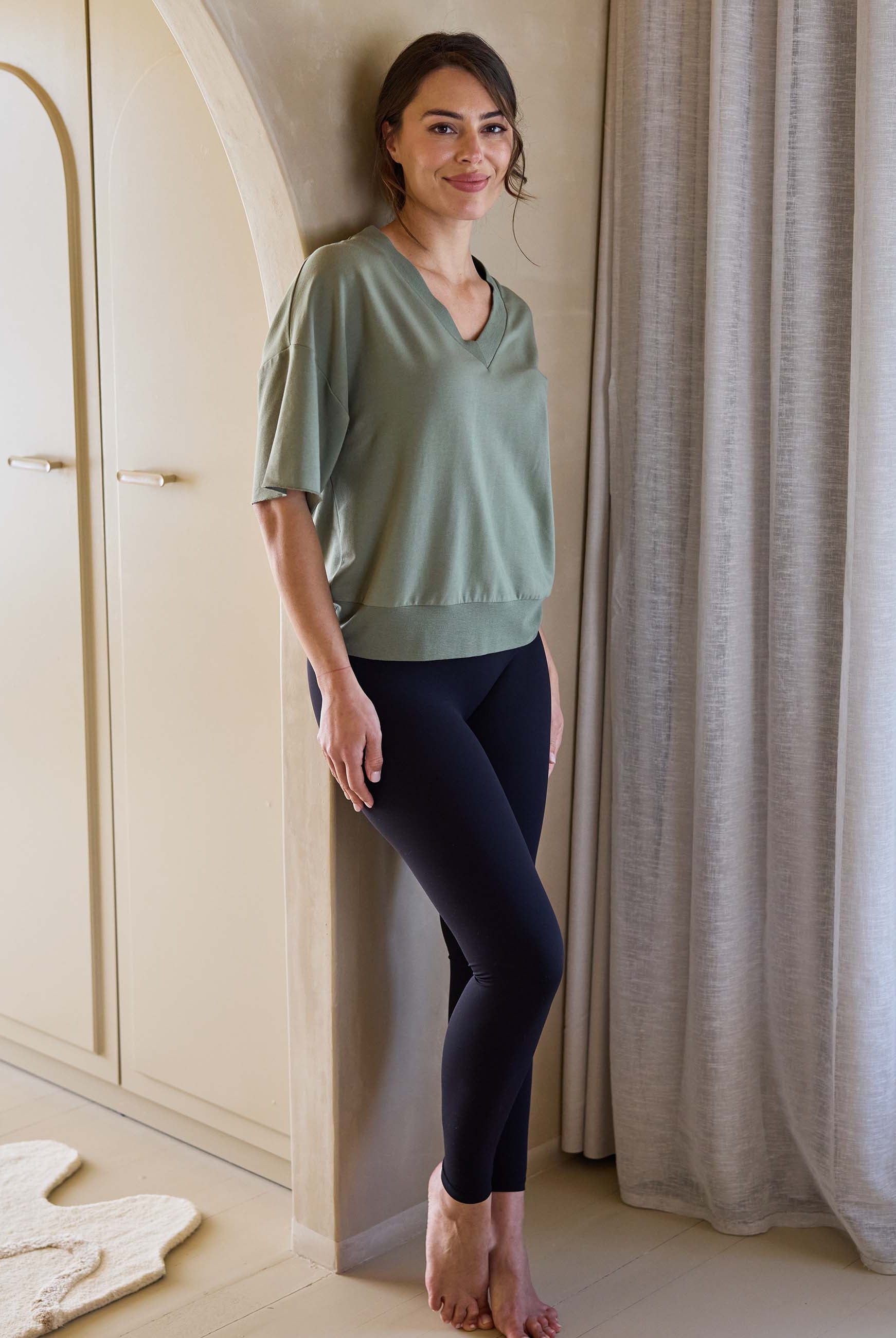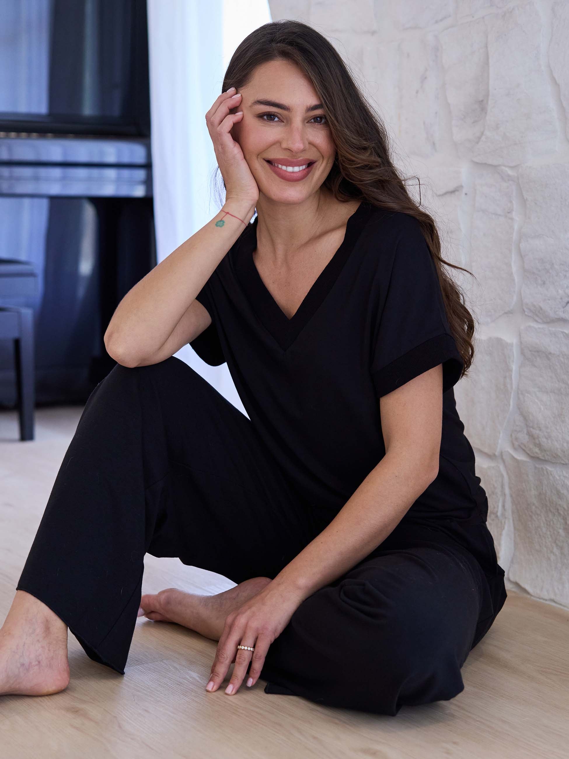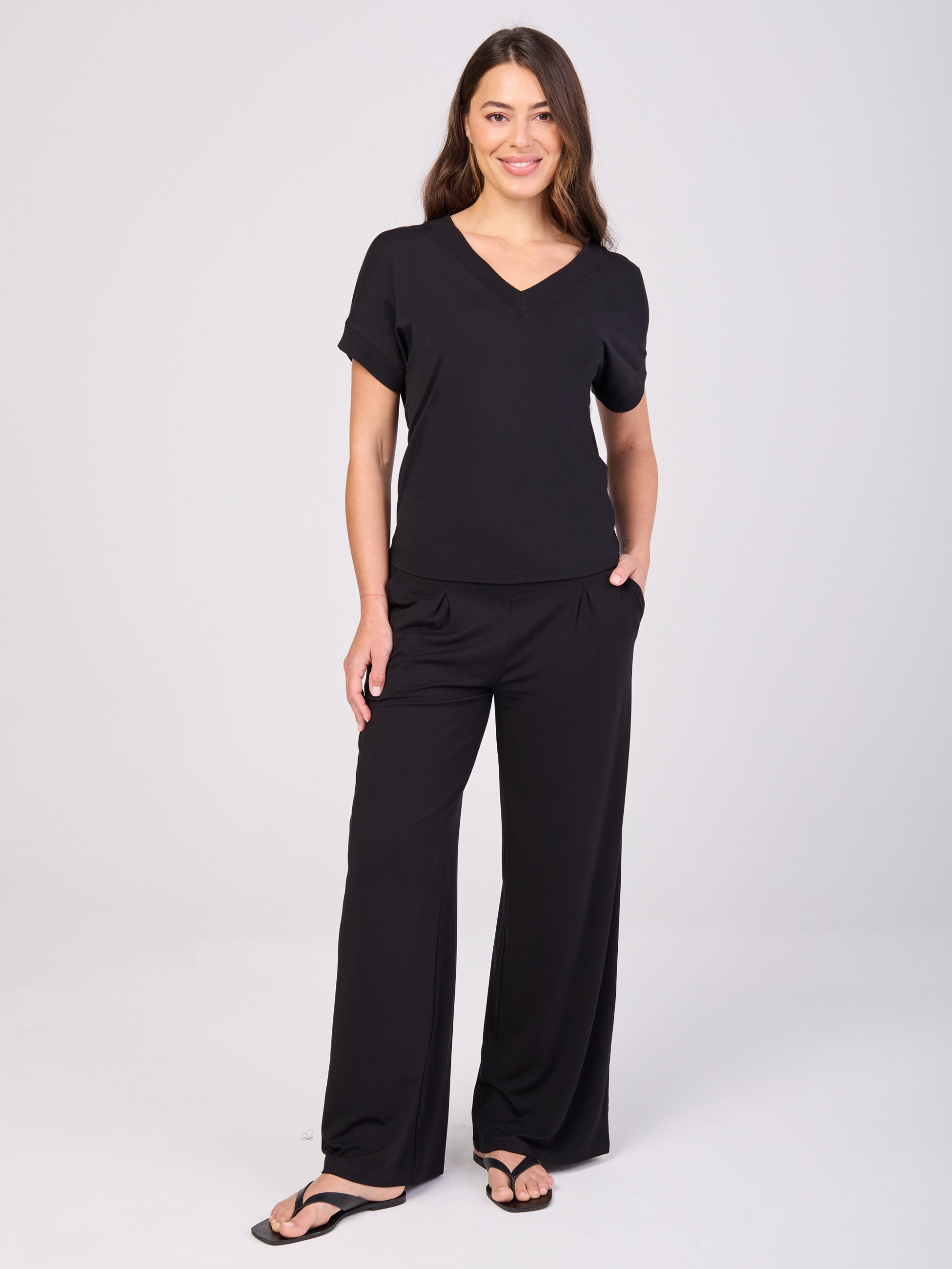 The Simone Tee is your new go-to essential, crafted from ultra-soft, sustainable Lenzing Modal®, a breathable and eco-friendly fabric known for its silky feel and draped elegance. Featuring a deep ribbed V-neck for a flattering, elongating silhouette, this tee offers timeless style with a modern edge. It is designed for versatility, so it pairs effortlessly with your favorite wide-leg pants, jeans, or layered looks.