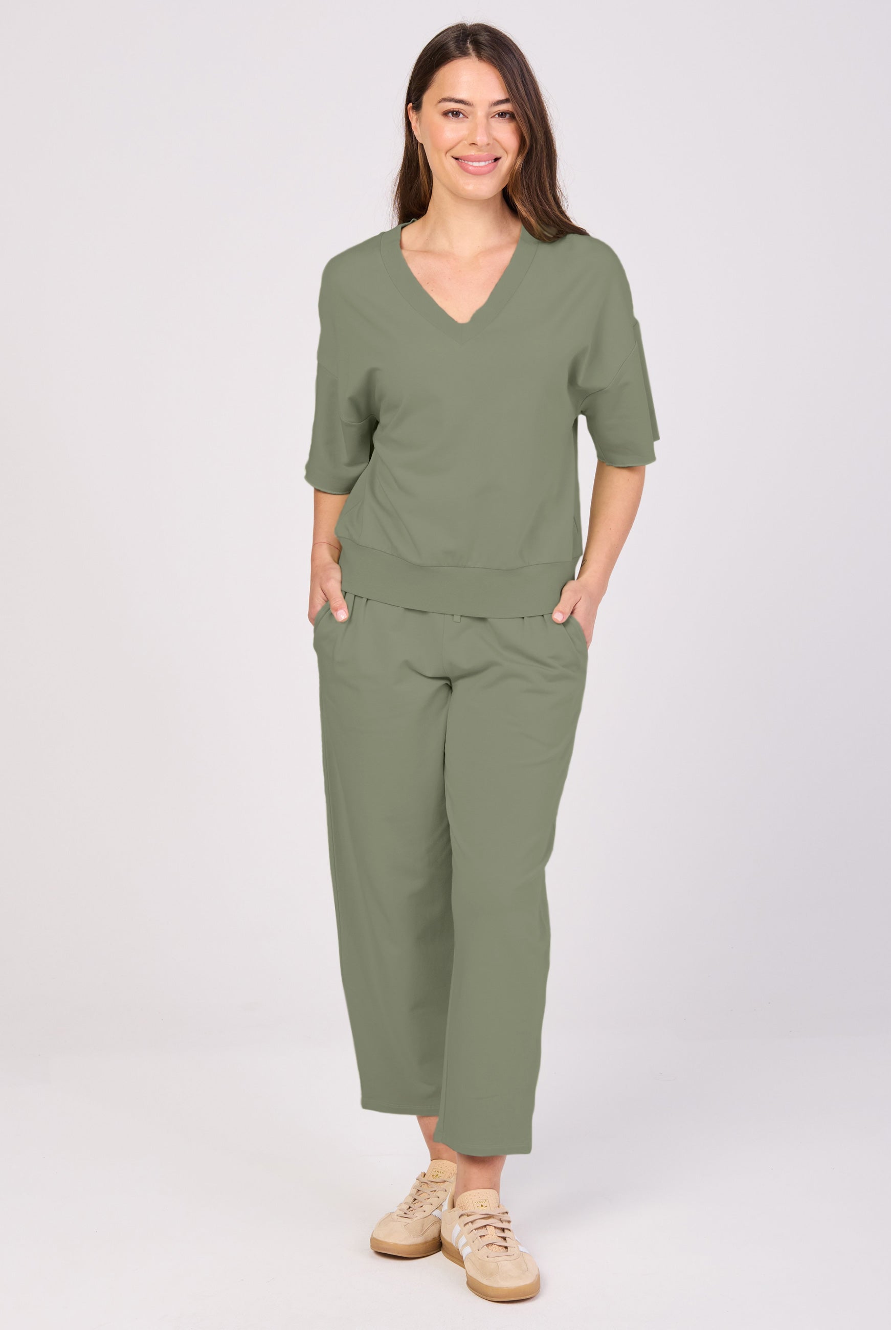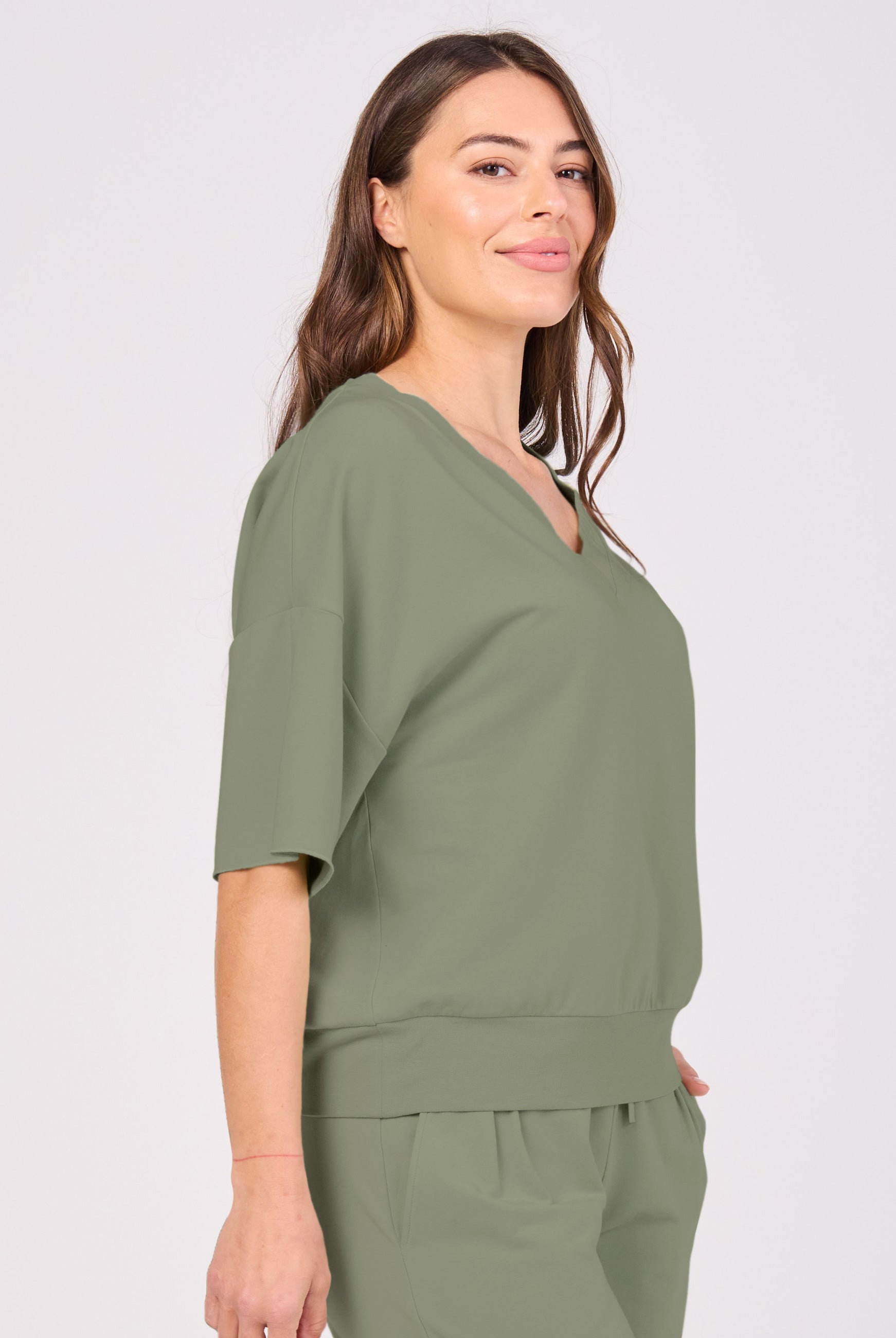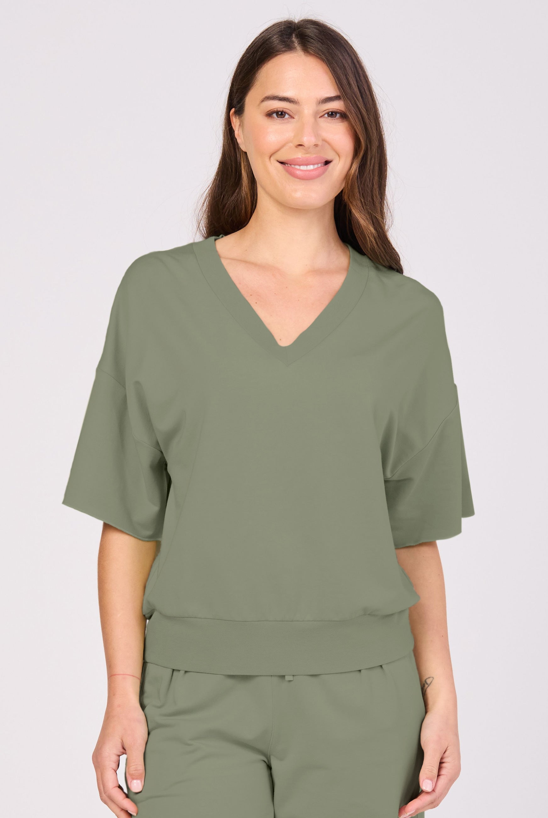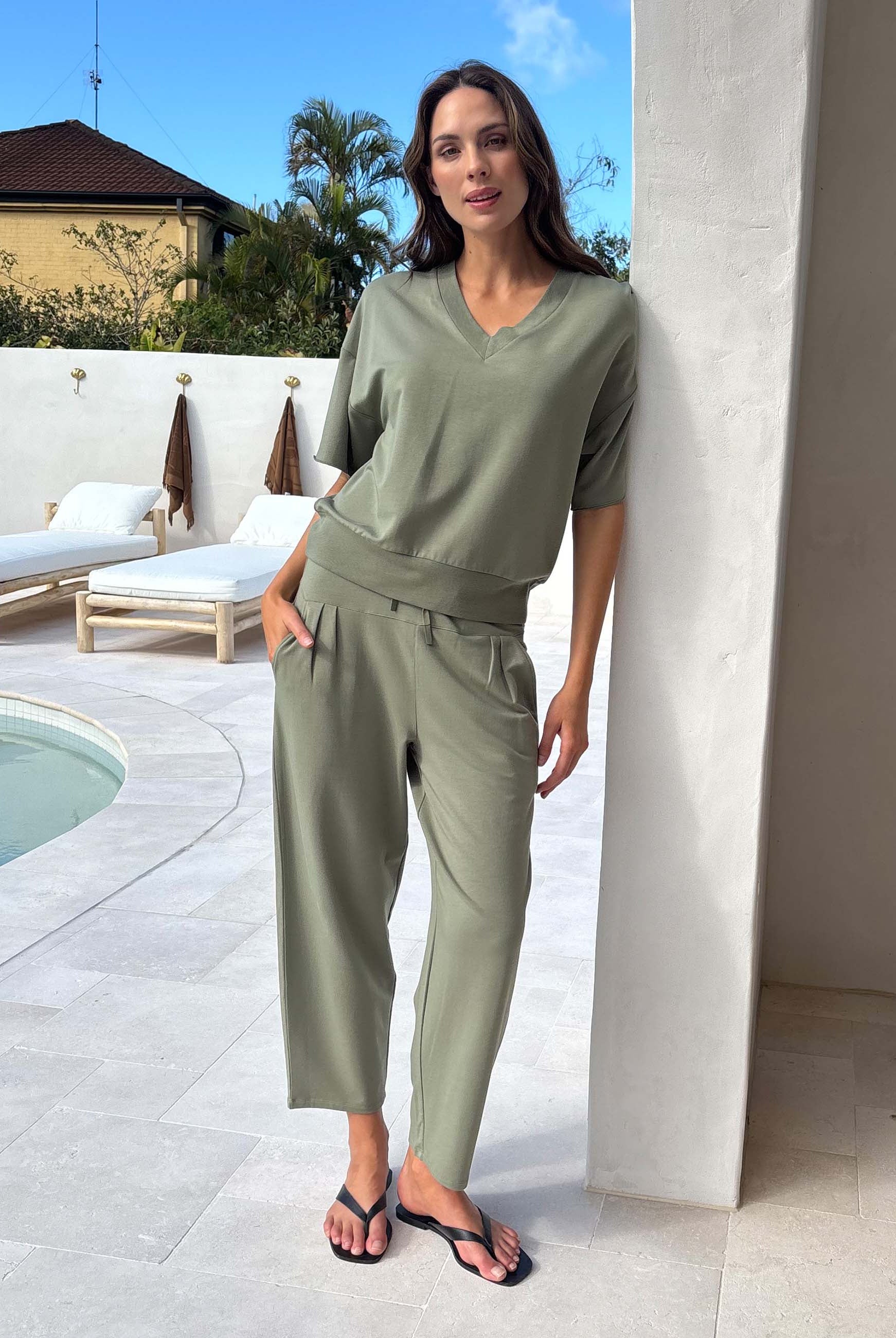 The Simone Tee is your new go-to essential, crafted from ultra-soft, sustainable Lenzing Modal®, a breathable and eco-friendly fabric known for its silky feel and draped elegance. Featuring a deep ribbed V-neck for a flattering, elongating silhouette, this tee offers timeless style with a modern edge. It is designed for versatility, so it pairs effortlessly with your favorite wide-leg pants, jeans, or layered looks.